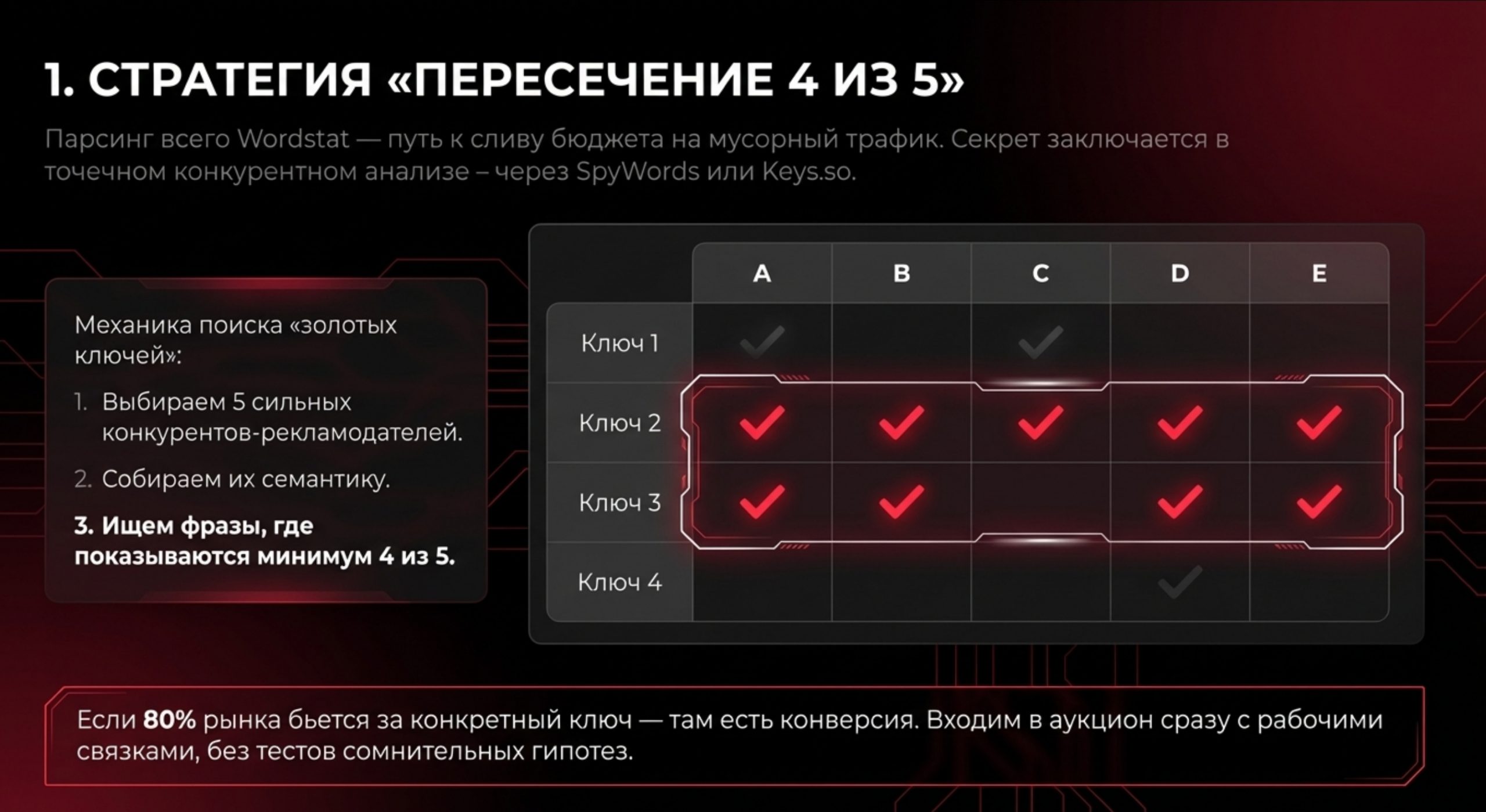 ✅Суть метода: выберите 5 сильных конкурентов-рекламодателей в вашей нише. Соберите их семантику и найдите фразы, по которым показываются минимум 4 из 5 игроков. Если 80% рынка «бьется» за конкретный ключ, значит, там есть конверсия и деньги.
