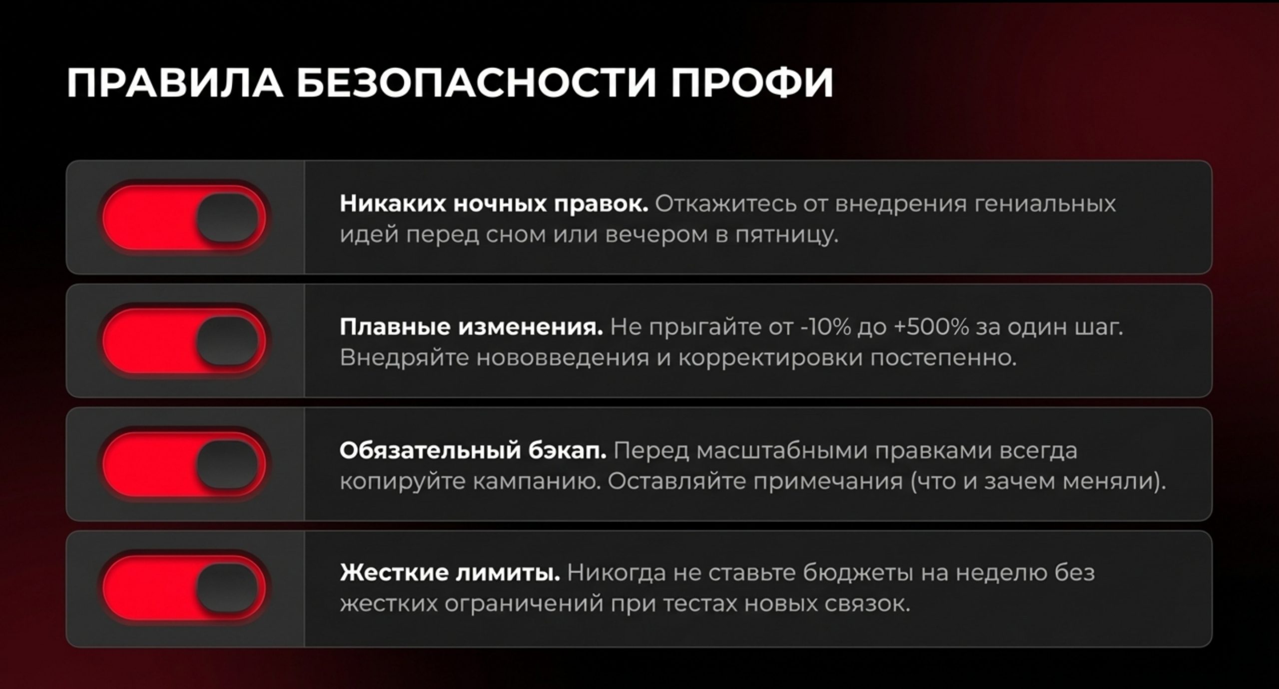 - Не ставьте бюджеты на неделю без жестких ограничений, если тестируете новые связки.