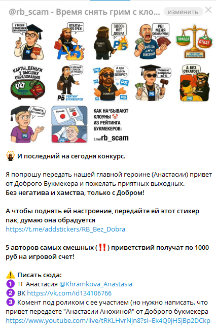 DobroBet не стали замалчивать ситуацию. Они создали канал, в котором представили всю историю конфликта — с эмоциями, скриншотами и видео. Параллельно букмекер начал запускать конкурсы и ивенты, где в ироничной форме высмеивали Анастасию — того самого менеджера РБ, что встала на сторону Дмитрия и требовала возврата депозита. Достойный ли это поступок для бизнеса — решаь вам.