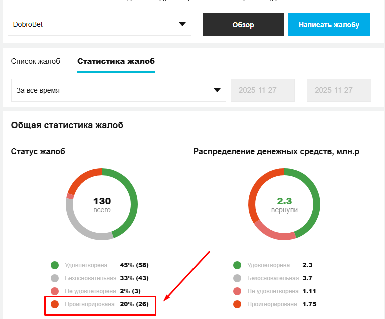 DobroBet и Рейтинг Букмекеров больше полутора лет работали плечом к плечу. Каждая жалоба разбиралась, споры обсуждались, и стороны слышали друг друга. Если букмекер оказывался неправ, он исправлял свои ошибки. Статистика самого РБ подтверждает это.