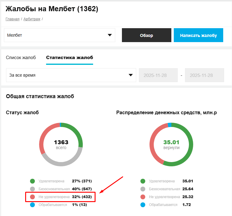 И вот что интересно. По данным самих РБ, у Мелбета примерно 32% жалоб остаются без ответа.