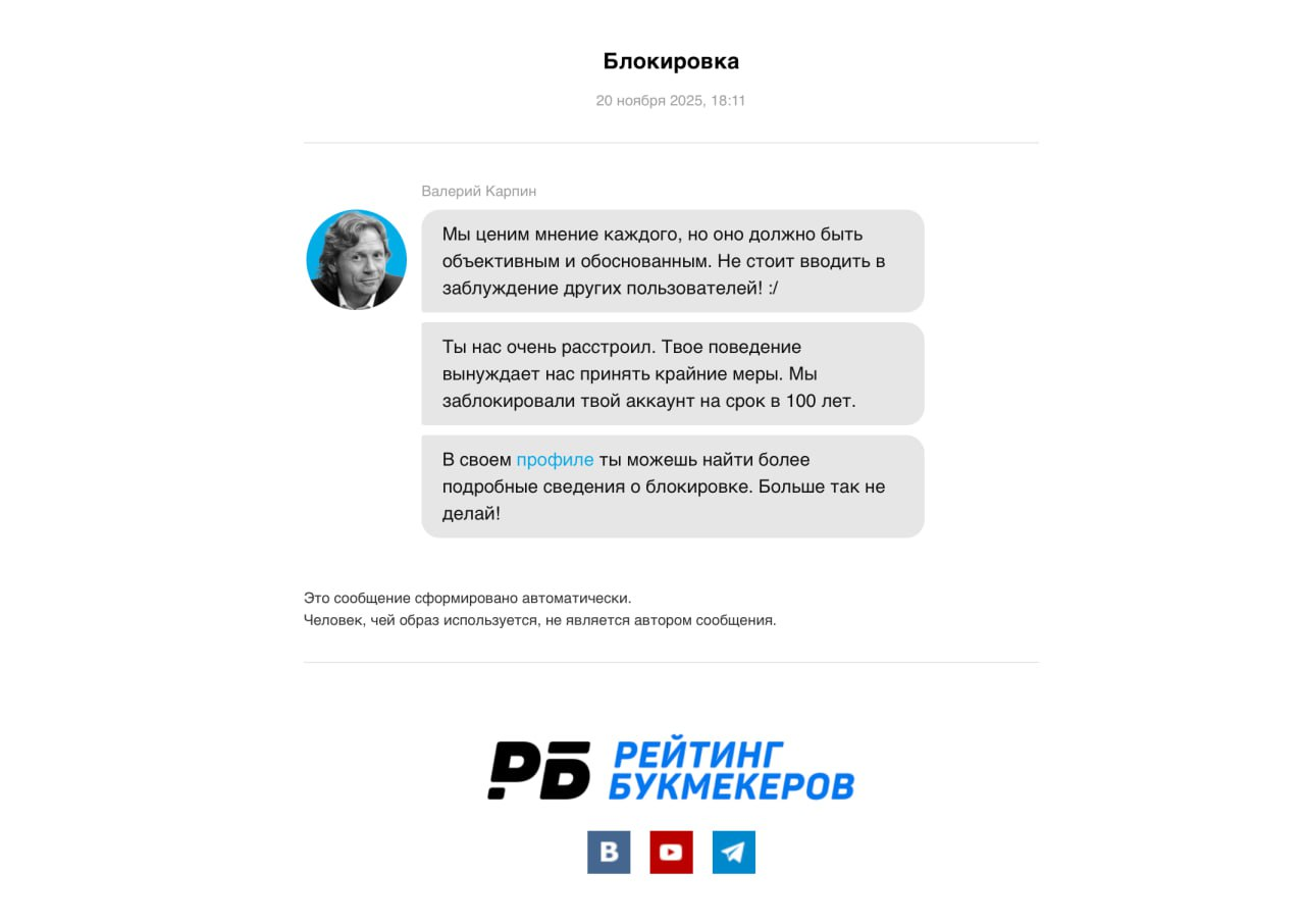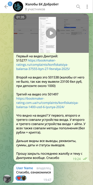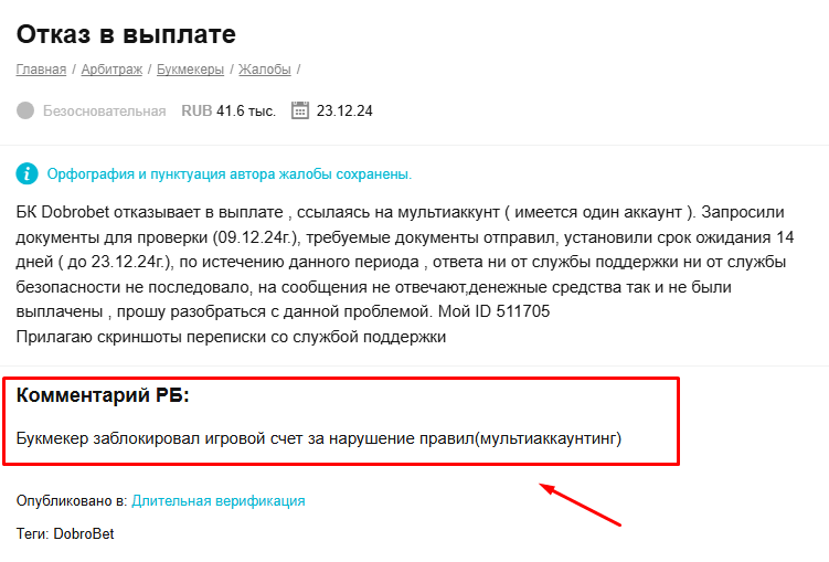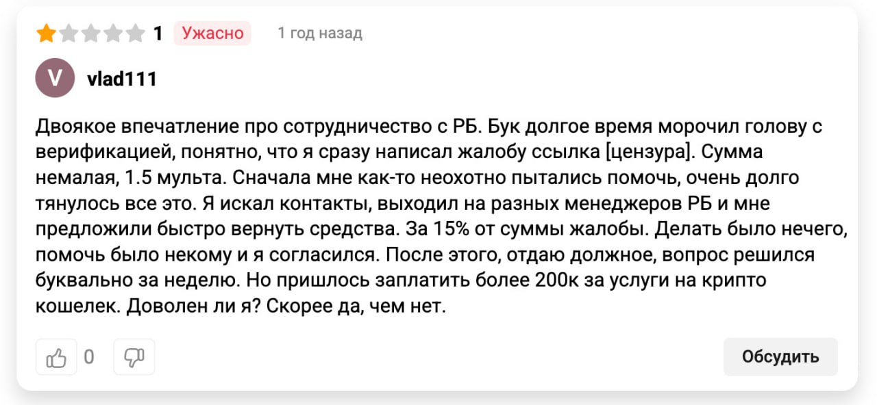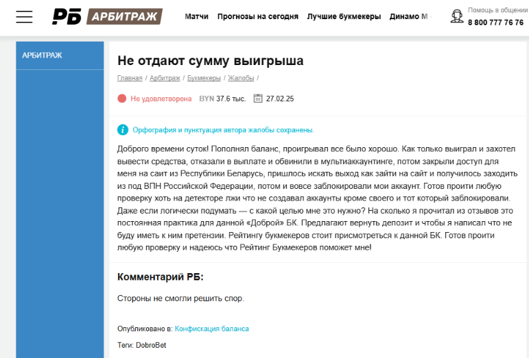 Кроме того, в сети довольно много негативных отзывов о работе РБ, и все они появились задолго до конфликта с Dobro.Bet. В этих историях часто всплывают одни и те же мотивы: странные выводы по жалобам, непрозрачные решения и намеки, а то и откровенные факты, указывающие на коммерческую лояльность площадки.