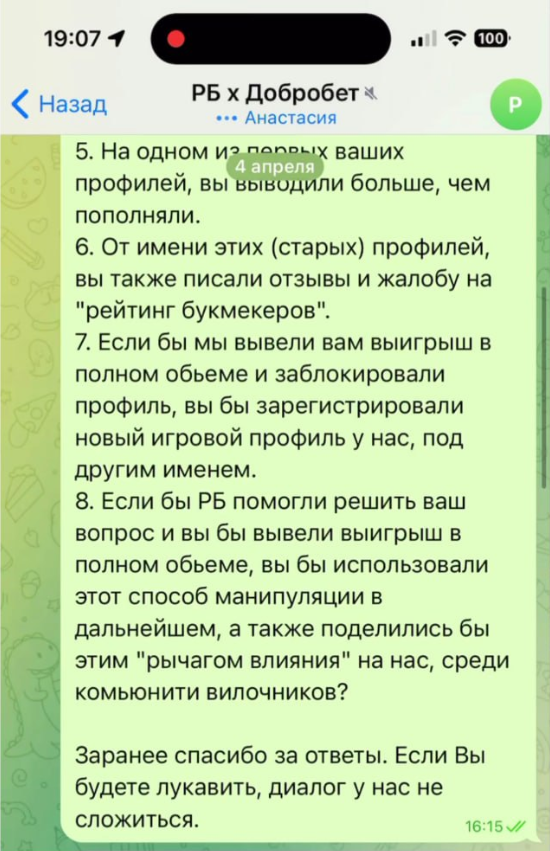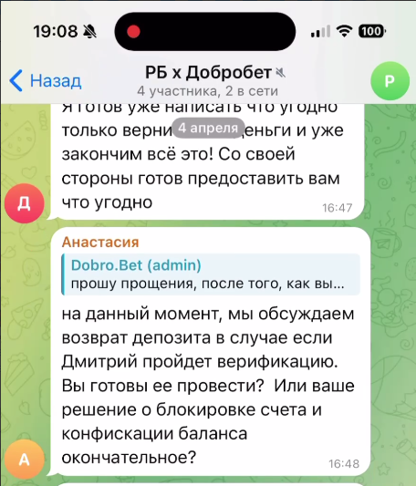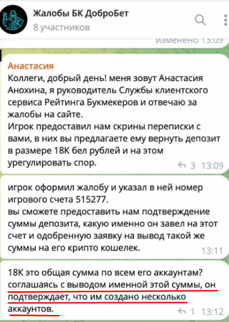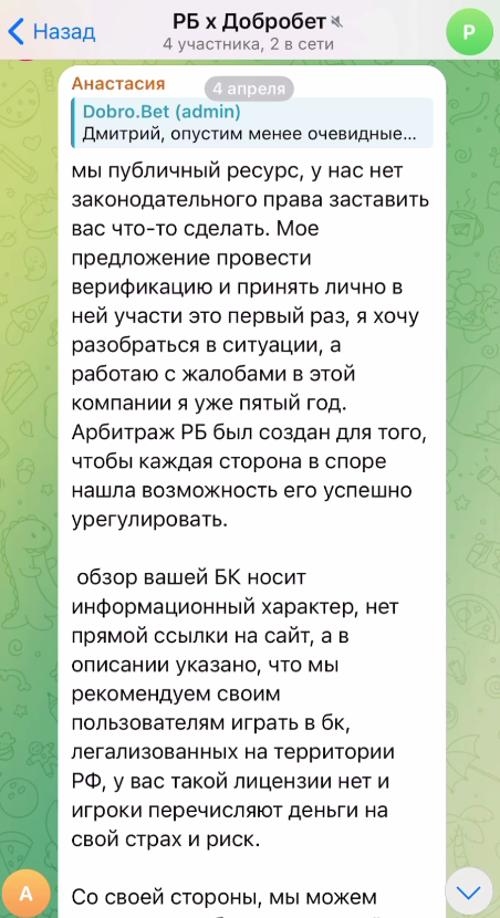 Чат был создан, но это не приблизило участников спора к решению проблемы. Дмитрий отрицал, что у него есть другие аккаунты, сотрудник ДоброБет отказывал ему в возврате депозита, а Анастасия, руководитель службы клиентского сервиса РБ, заняла странную позицию: