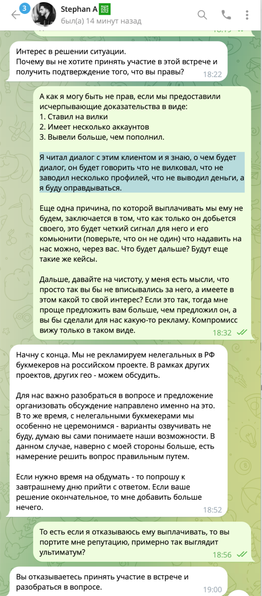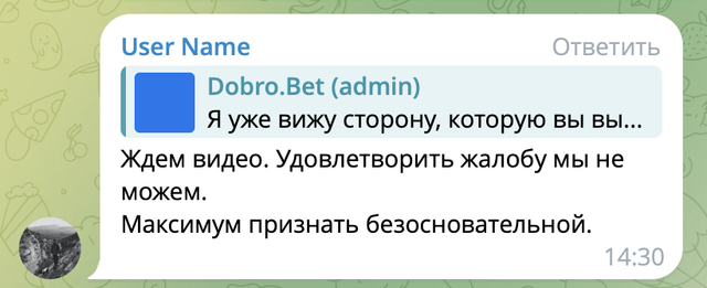 Это не убедило менеджеров Рейтинга в том, что игрок нарушает правила. Было выставлено новое условие — создать трехсторонний чат с Дмитрием, сотрудниками Рейтинга и ДоброБет. Причем сразу оговаривалось, что единственное решение, которое РБ видит — это возврат депозита игроку.