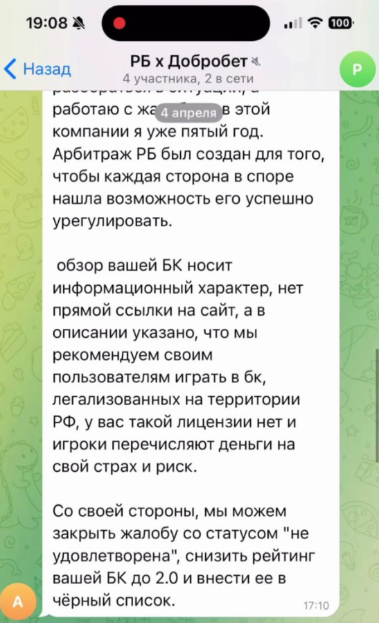 С одной стороны, РБ формирует рейтинги и принимает решения, демонстрируя коммерческую лояльность и возможность влиять на оценки и решения по жалобам. С другой стороны, Dobro.Bet показывает готовность бороться за репутацию, но использует своеобразные методы давления и переходы на личности в адрес сотрудников.