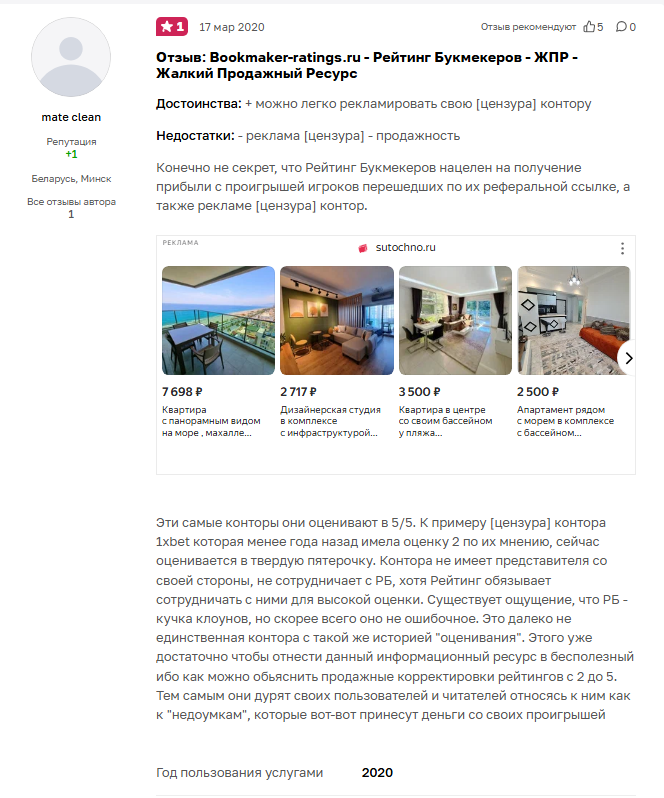 «Они сами пишут негативный обзор на букмекерскую компанию и ждут вашей реакции. Вы им пишете, и диалог начинается. Подтвердить уже не смогу, переписка осталась в старом скайпе. Но если не ошибаюсь около $600–700 взяли за нормальный подробный обзор. Он тоже не был позитивным, просто без негатива и с тремя звездами вместо двух. И, конечно, сразу предлагают рекламу и полный пакет услуг»