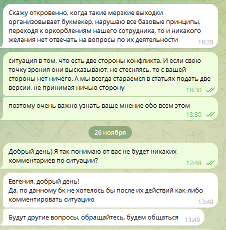 К сожалению, так и не приняв компромиссного решения по жалобе Дмитрия, стороны не разошлись по углам. Наоборот, противостояние между букмекером и рейтинговой площадкой стало гораздо жестче.\