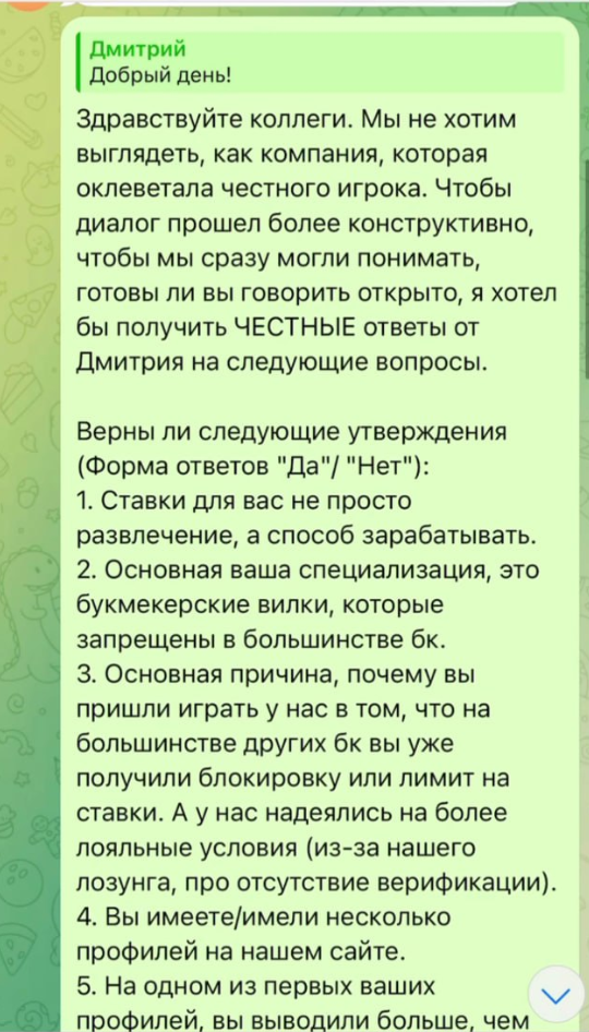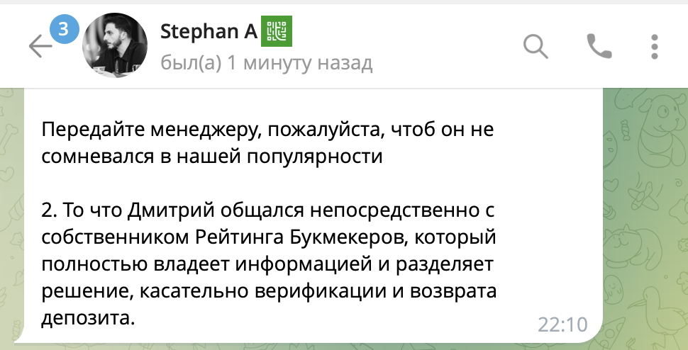 Стоит отметить, что тот самый игрок Дмитрий вел прямой диалог с собственником Рейтинга букмекеров. И владелец поддержал его позицию касательно верификации и возврата депозита.