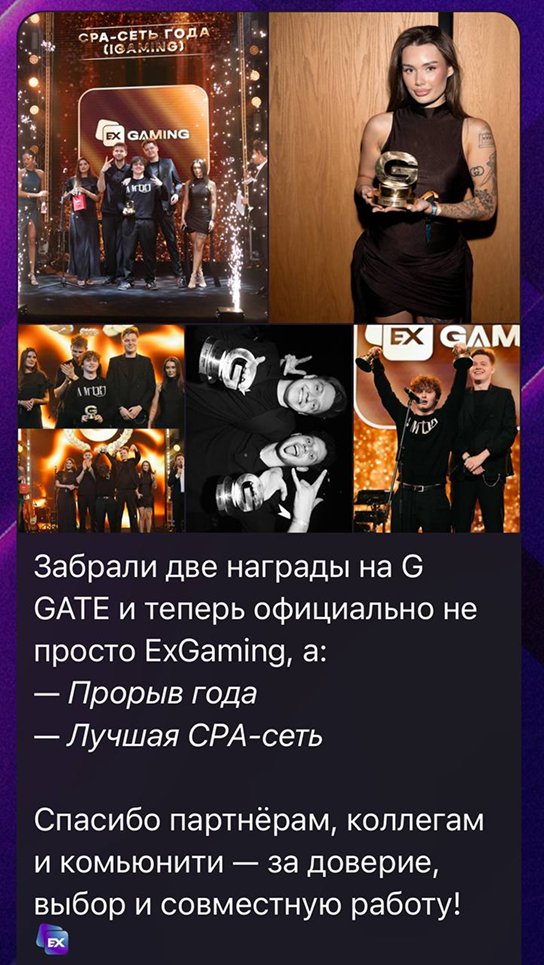 ExGaming — это молодая CPA-сеть, которая вышла на рынок в апреле 2024 года. За это время они успели получить громкую награду на G GATE CONF — статуэтки в номинациях «Прорыв года» и «Лучшая CPA-сеть». Вроде бы это солидная награда за 1 год работы на рынке.