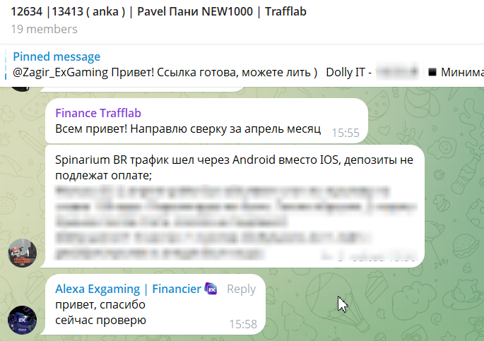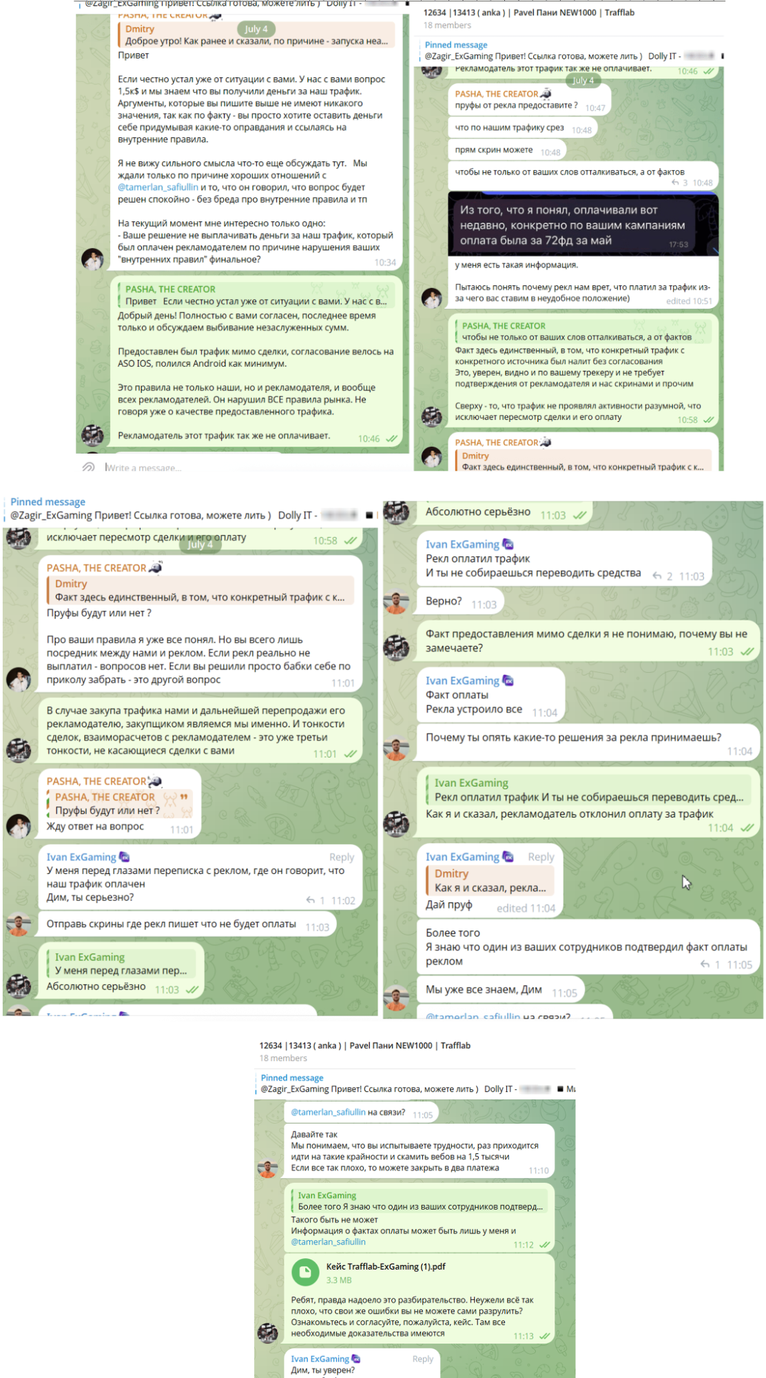На следующий день это подтвердили окончательно — почти весь трафик ушел в холд из-за низкого качества. ExGaming ответ не понравился, и они запросили доказательства. В ответ LGaming скинули скрин переписки с рекламодателем, но без суммы.