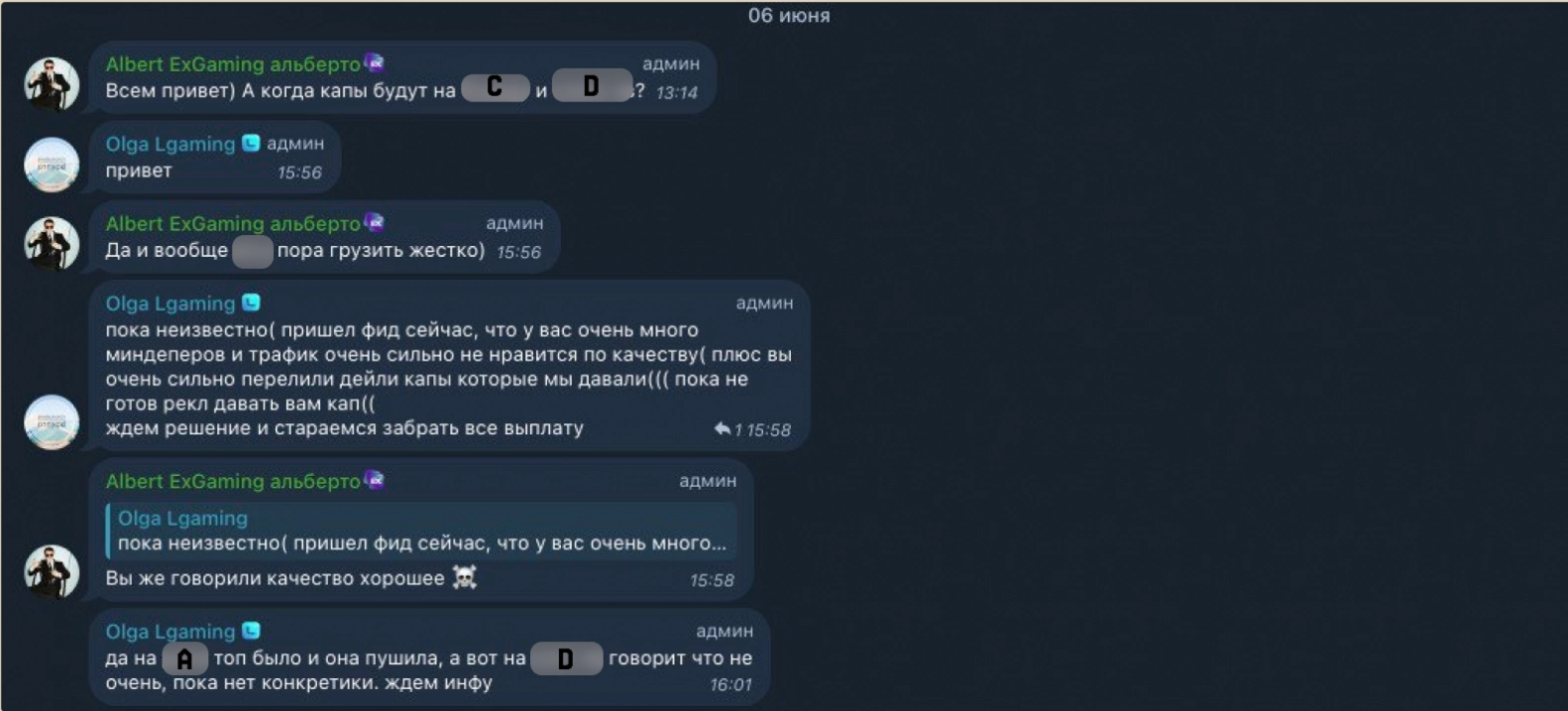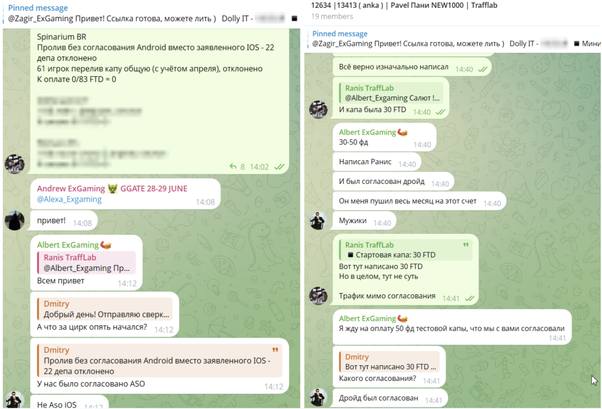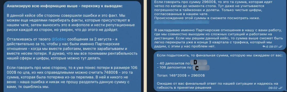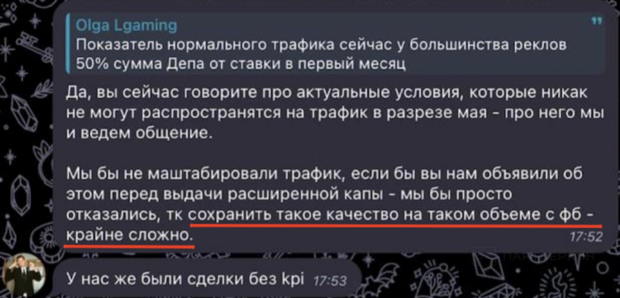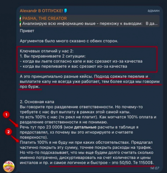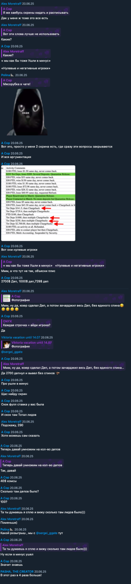В ответ ExGaming начали обвинять партнерку: если вы дали капу в 5 раз больше — значит, были уверены в нас и в том, что рекламодатель готов этот трафик закупать. По их логике, если инициатива масштабирования шла от менеджера, значит, он и несет риск, а команда — просто лила трафик в рамках выданной капы. Фактически, они пытались переложить ответственность на ПП.