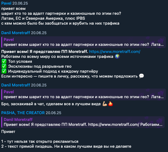 Суть вот в чем: веб спросил совета про партнерки на определенные ГЕО. Ему ответили ребята из MoreTraff и предложили свои услуги.