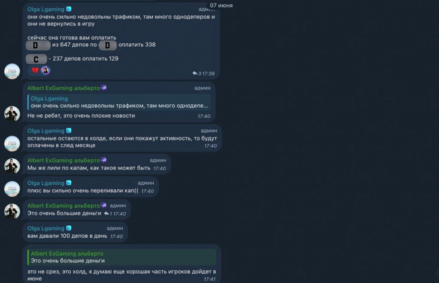 Первый кейс произошел в конце мая 2024 года, через месяц после запуска работы ExGaming. Перед историй конфликта, важно знать, что команда ExGaming уже около месяца работала с партнеркой LGaming.