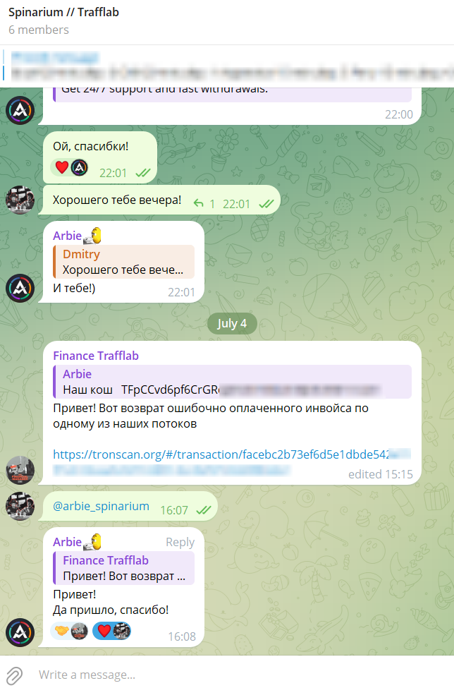 В кейсе Trafflab признали, что получили оплату за трафик, но потом вернули деньги, так как рекламодатель ошибочно оплатил его. Свой возврат они подтверждают скринами.