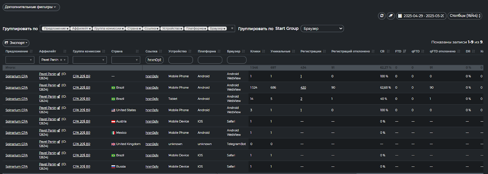 Позже LGaming прислали выгрузку по одному из офферов от рекламодателя: