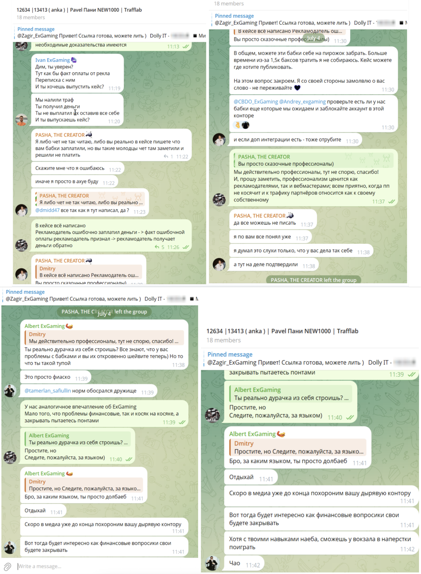 После еще нескольких десятков оскорблений ExGaming «сжалились» и дали время Trafflab до четверга оплатить 72 FTD. Иначе — публичное разбирательство.