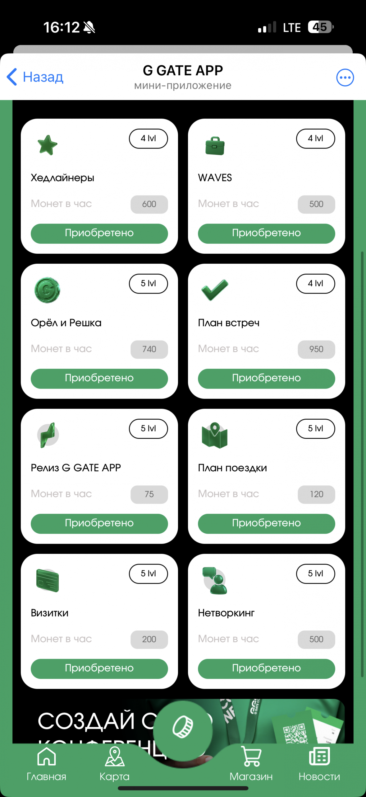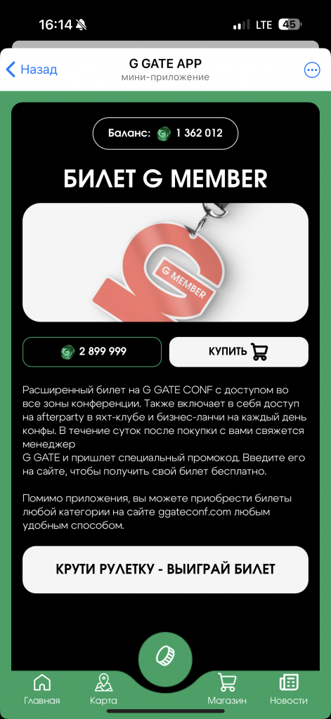 Совсем забыл сказать, что еще одним способом получения монеток были слова дня – их прятали куда угодно: в спонсорские материалы, озвучивали на стримах, давали за прохождение специальных заданий, например, за квиз по арбитражной истории от Артема Кравченко можно было получить целых 220 000 монеток. А еще каждый день давали по 10 000 G COINS просто за открытие мини-аппки. На таких бонусах я накопил примерно 4 000 000 монеток (здесь я не считаю то, что получал от рулетки и от тапаний раз в 8 часов). Для понимания, много это или мало, за 3 299 000 монет можно было купить билет категории G Member, который на официальном сайте стоил ближе к мероприятию $279. Таким образом, на конференцию можно было буквально “натапать” без финансовых вложений.