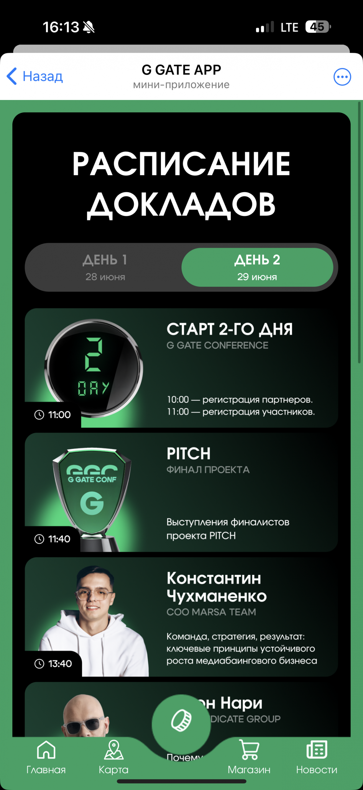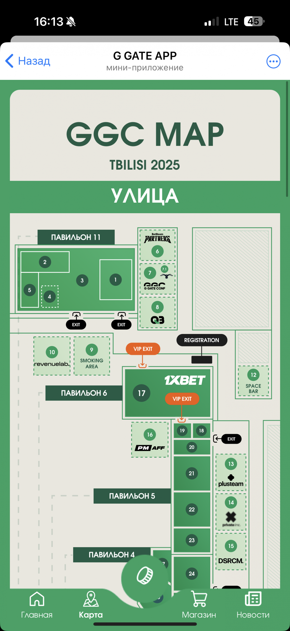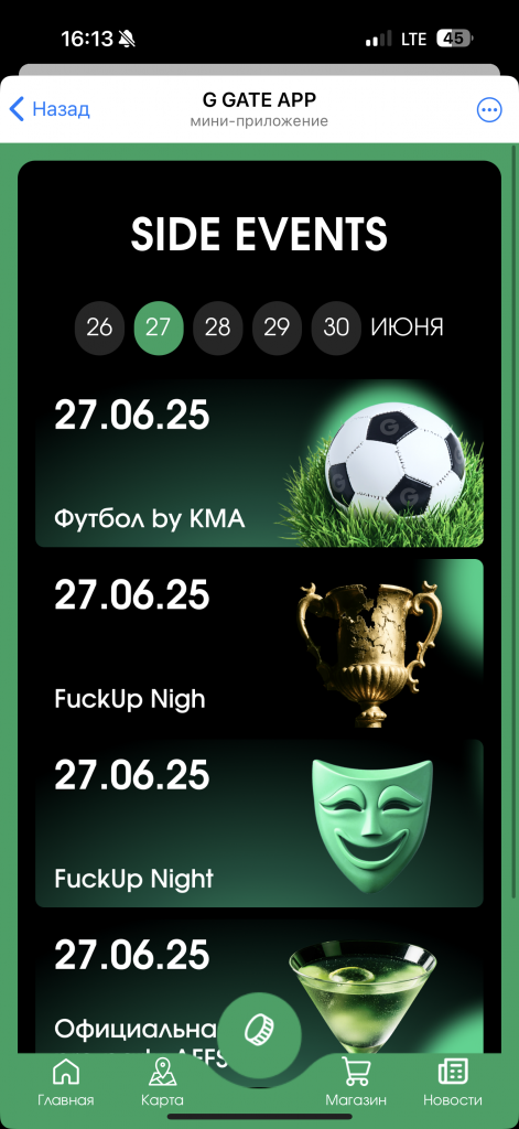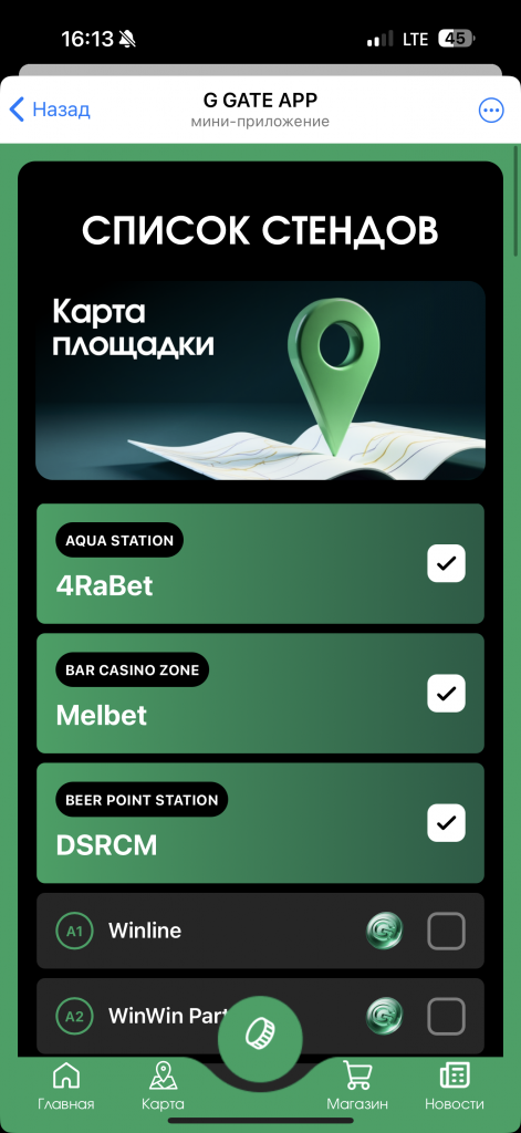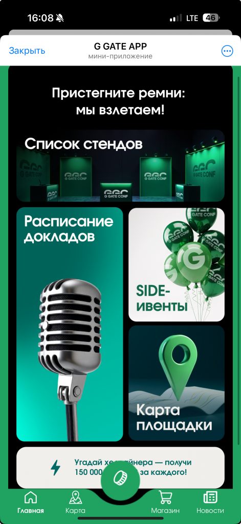 Но чего-то явно не хватало. В воздухе витал неловкий вопрос “а будет ли что-то большее, чем общение в чате?” Обычно, все работает по следующему принципу: есть сайт с продажей билетов на конференцию, на нем же – карта стендов и список спонсоров, а бонусом – какой-нибудь чат, который умирает через пару дней после мероприятия и воскресает как феникс из пепла ровно через год, уже под следующую итерацию конференции. Если с чатом все и так ясно, то к сайтам всегда есть вопрос, потому что в 9/10 случаев на самой конференции, где тебе нужна карта для навигации, они либо совсем отваливаются и умирают, либо сделаны так, чтобы ими удобно было пользоваться исключительно с десктопной версии. Мы ранее уже видели как G GATE реализовал ТГ-бота под свои лектории Waves и было очевидно, что под свою первую “конференцию” они не упустят шанса сделать нечто подобное.