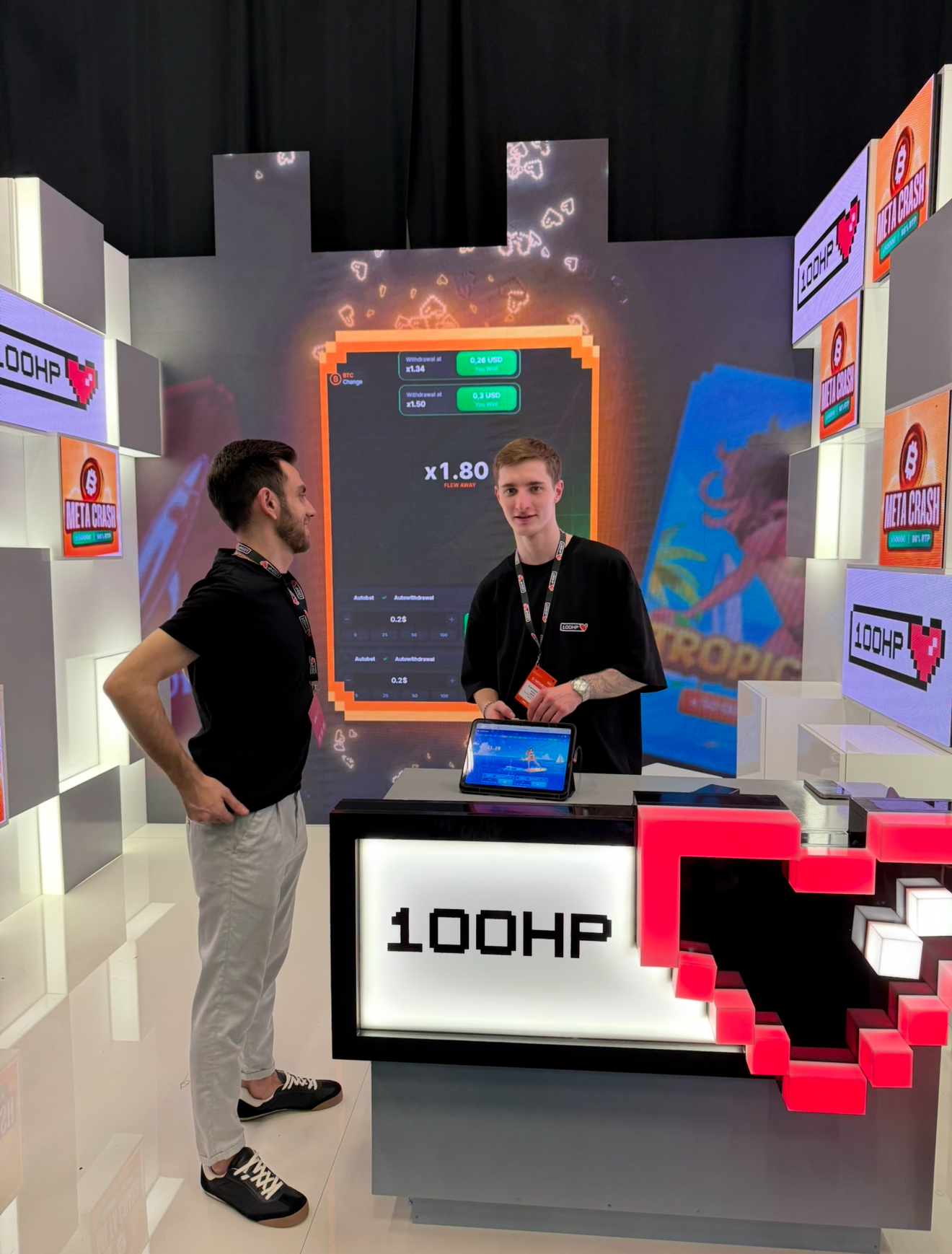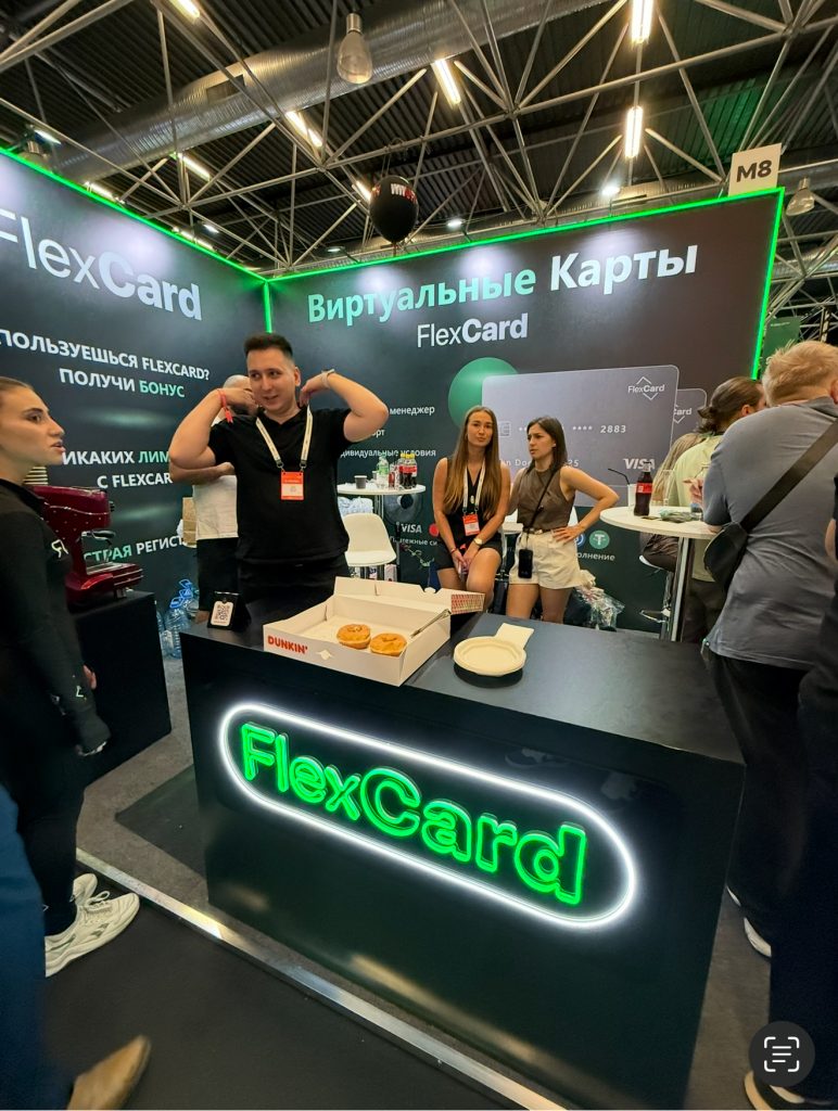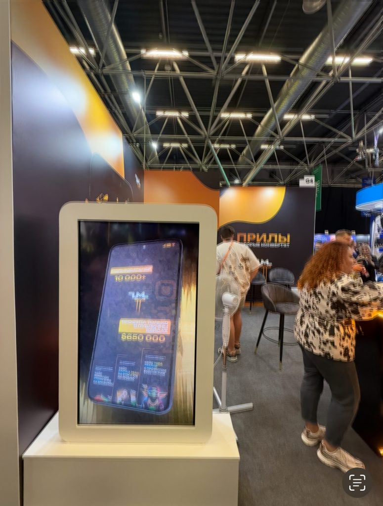 Здесь глаз зацепился за тележку с холодными напитками от WWGroup, неоновые элементы у FlexCard, неоновые экраны и пиксельные декорации у 100HP и стенд Dolphin, где можно было вытянуть карту с тарифом на антик прямо из самого стенда – очень креативный подход ко взаимодействию со стендом.