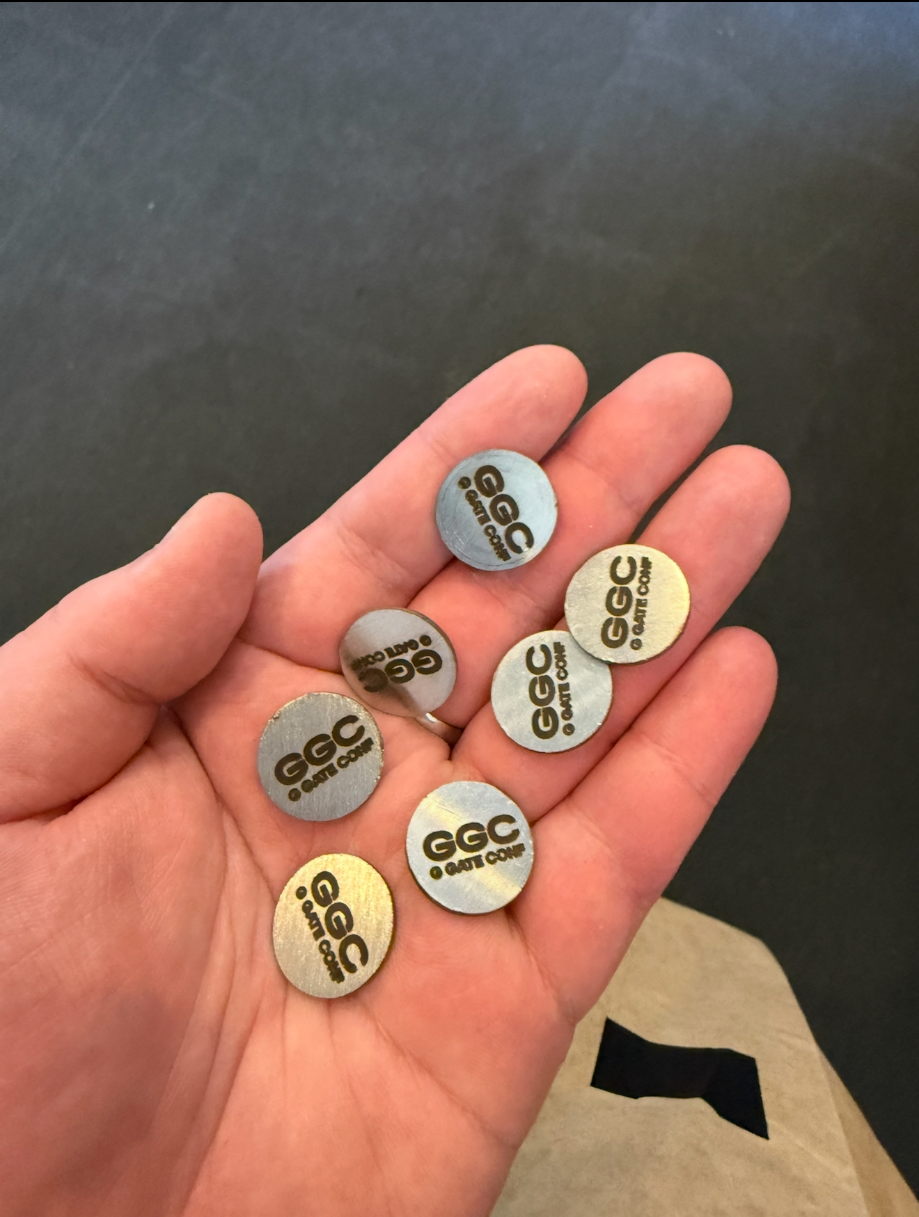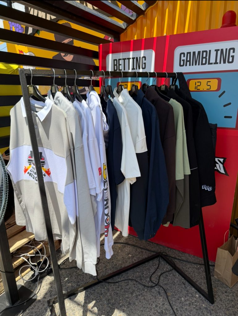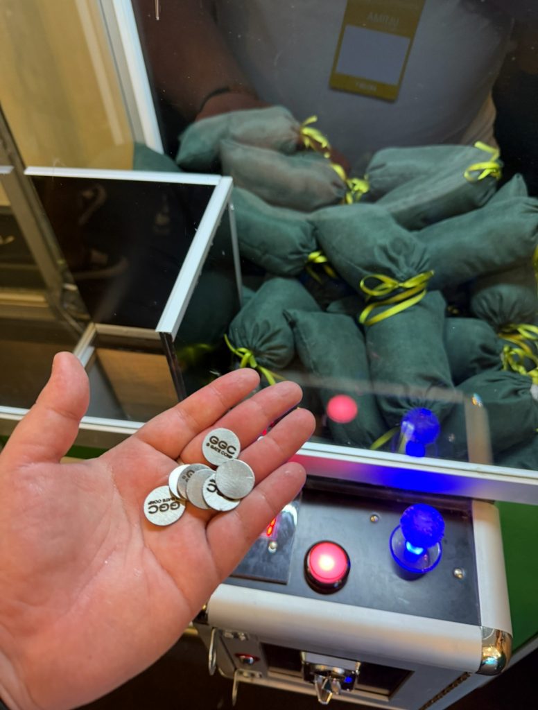 Самое время разорить G GATE MERCHSHOP! У меня было целых 7 токенов, которые я честно заработал в рулетке в обмен на свои нервные клетки и сбитый режим сна. Механика была очень простой: давались монетки, которые нужно было пихать в классический автомат с клешней, прямо как в детстве, и вытягивать мешочки. Внутри мешочков на бумажке написано какой приз тебе достанется – угадать было невозможно – полная лудка! Волновал многих вопрос, а что будет, если мешочек упадет? Просто давали новый жетончик, пока ты наконец не вытянешь заветный мешок с гарантированным призом. В мерчшопе мне удалось вытянуть обложку на паспорт, брелок, штаны и лонгслив от G GATE, из новой коллекции LOST & FOUND, а также пахучки в машину, визитницу и спиннер от Paykassma Partners.