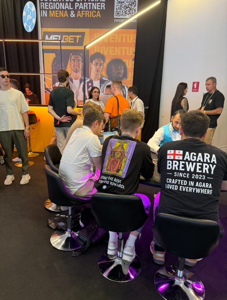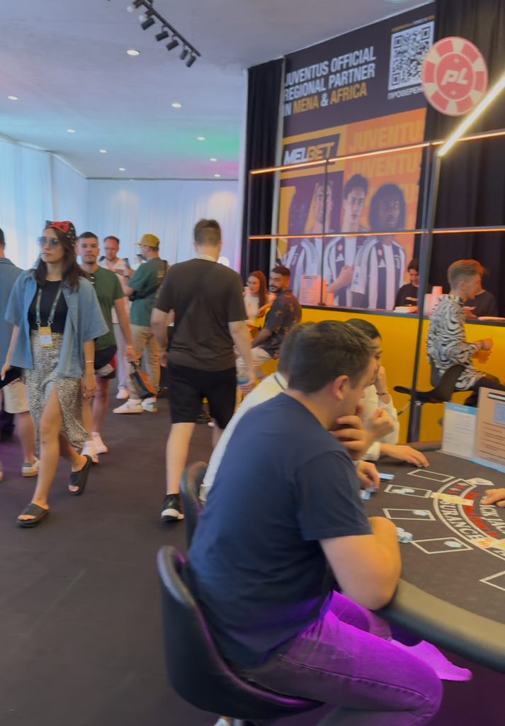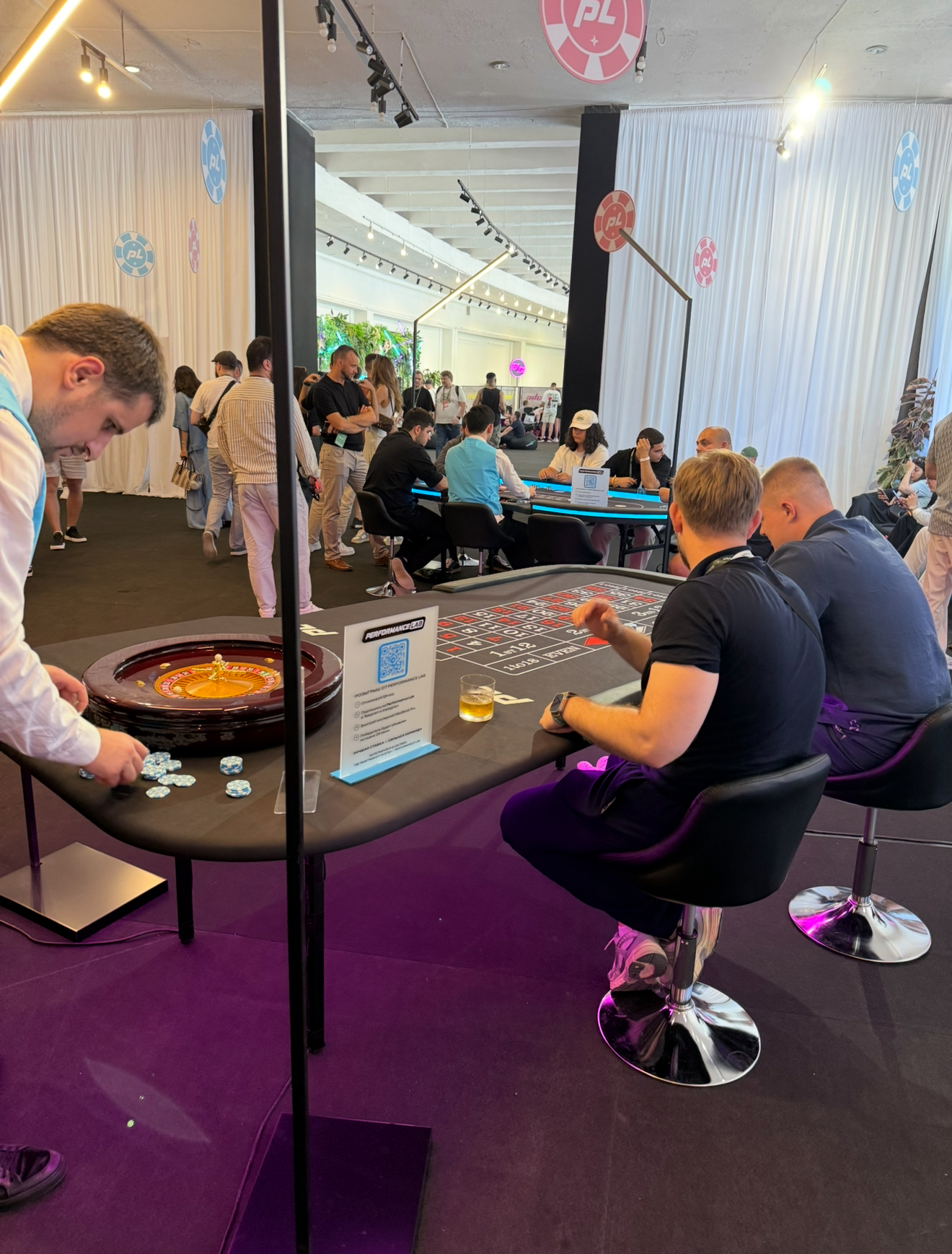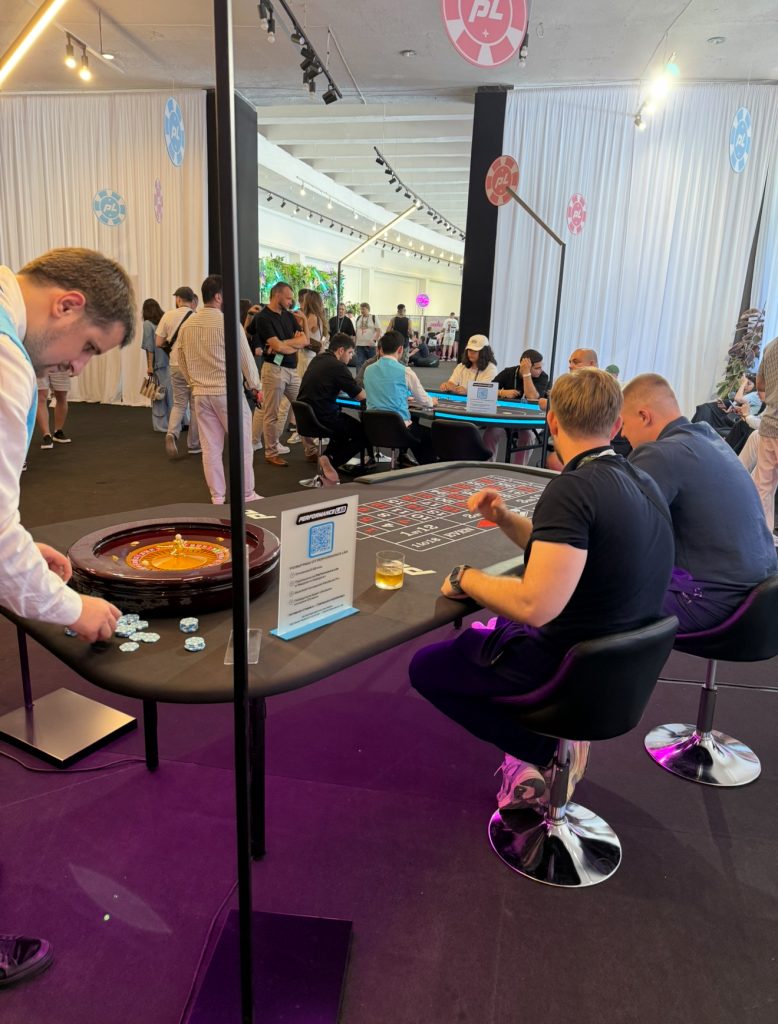 Проходим далее и попадаем в настоящее казино. Рулетку и покерные столы спонсировали Performance.Lab (крупная медиабаинговая компания внутри экосистемы 1win). Подле них разливали горячительные напитки на баре от MELBET (прямой рекламодатель в gambling и betting). Вдалеке за белой ширмой находилась зона под подкастов от 1win Partners (официальная партнёрская программа и прямой iGaming-рекламодатель международной букмекерской компании 1win).