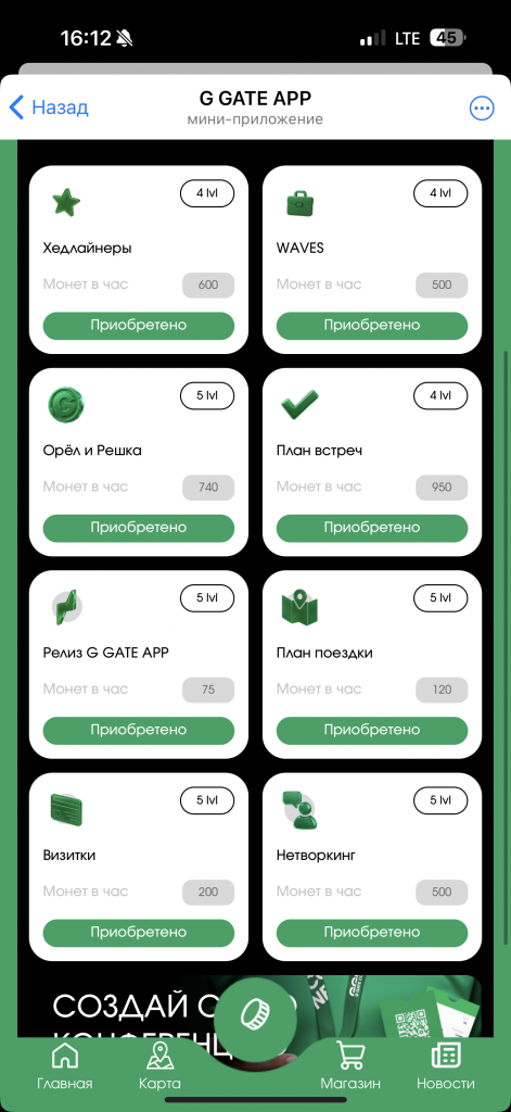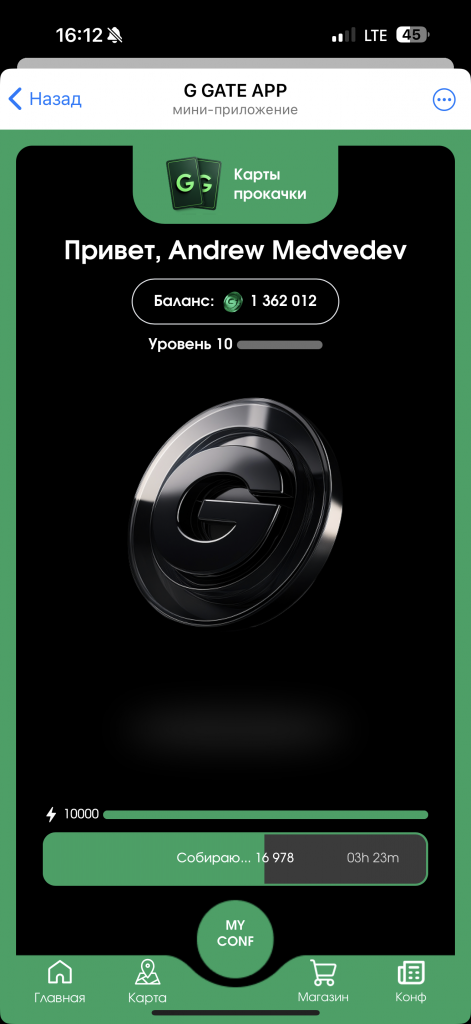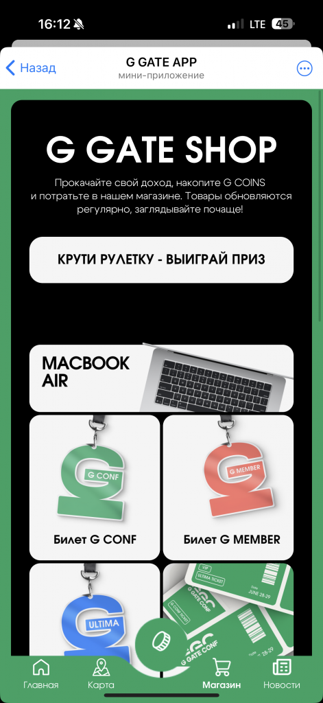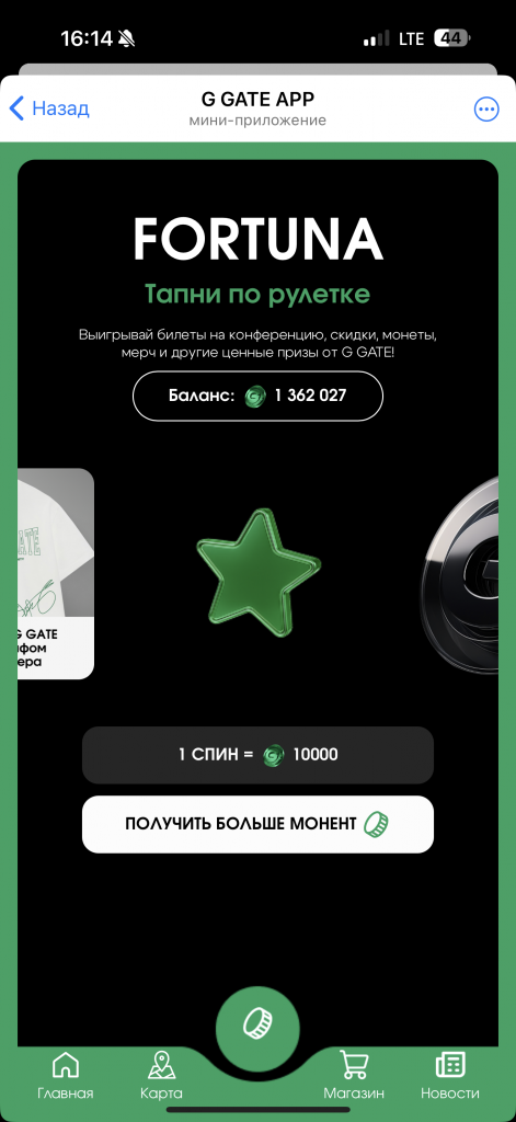 G GATE APP стал настоящей бомбой, в хорошем смысле этого слова. На ранних этапах, примерно за 60 дней до конференции, предлагалось собрать свою собственную мини-конференцию, выбрав понравившиеся компании и спикеров, прокачать карточки, чтобы получать внутреннюю валюту G COINS. Классическая “тапалка” нужна была не просто так: любой пользователь мог обменять свои монетки на ценные призы в разделе MERCH SHOP. Там было представлено все: от макбуков, айфонов, билетов на конференцию и мерча G GATE до подарочных наборов от спонсоров и подписок на различные сервисы для арбитража. Но мы же все помним, что G GATE ранее расшифровывался как “Gambling Gate”, соответственно, выпускать обычную тапалку ребята точно не планировали. На накопленные G COINS можно было крутить “рулетку”. Одна прокрути = 10 000 G COINS. В рулетке могли выпадать как паки монет различного номинала (от 1000 до 1 000 000 G COINS), так и с меньшим шансом что-то из магазина Merch Shop.