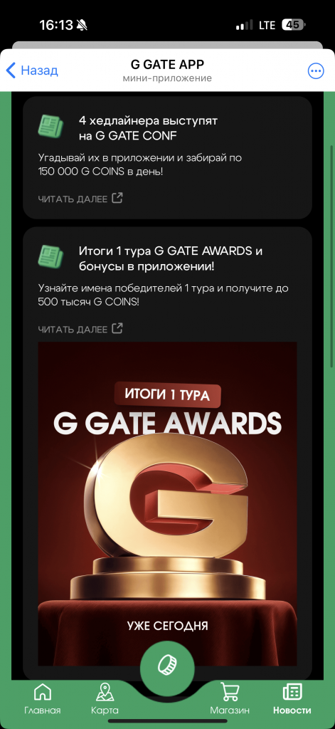 ТГ-бота мы не получили, зато завезли целый G GATE APP на базе Telegram Mini Apps.