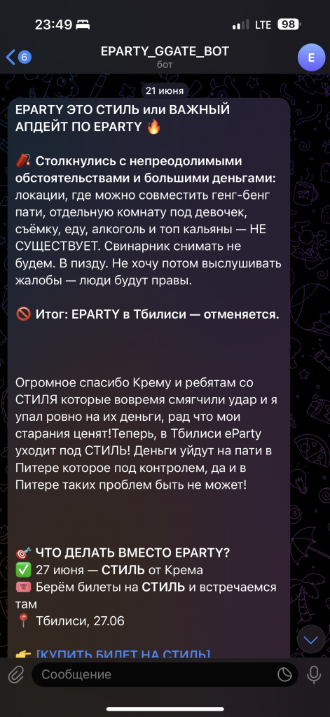 Раз уж мы заговорили о Стиле, то невозможно не вспомнить о его ярчайшей PR-кампании. Гений, человек, “который провел свет в будку” всему арбитражному миру в СНГ, главный инфлюенсер индустрии и без всякой иронии настоящий гуру маркетинга и арбитража, Иванов Евгений Юрьевич, вышел на новый уровень в своих перформансах.