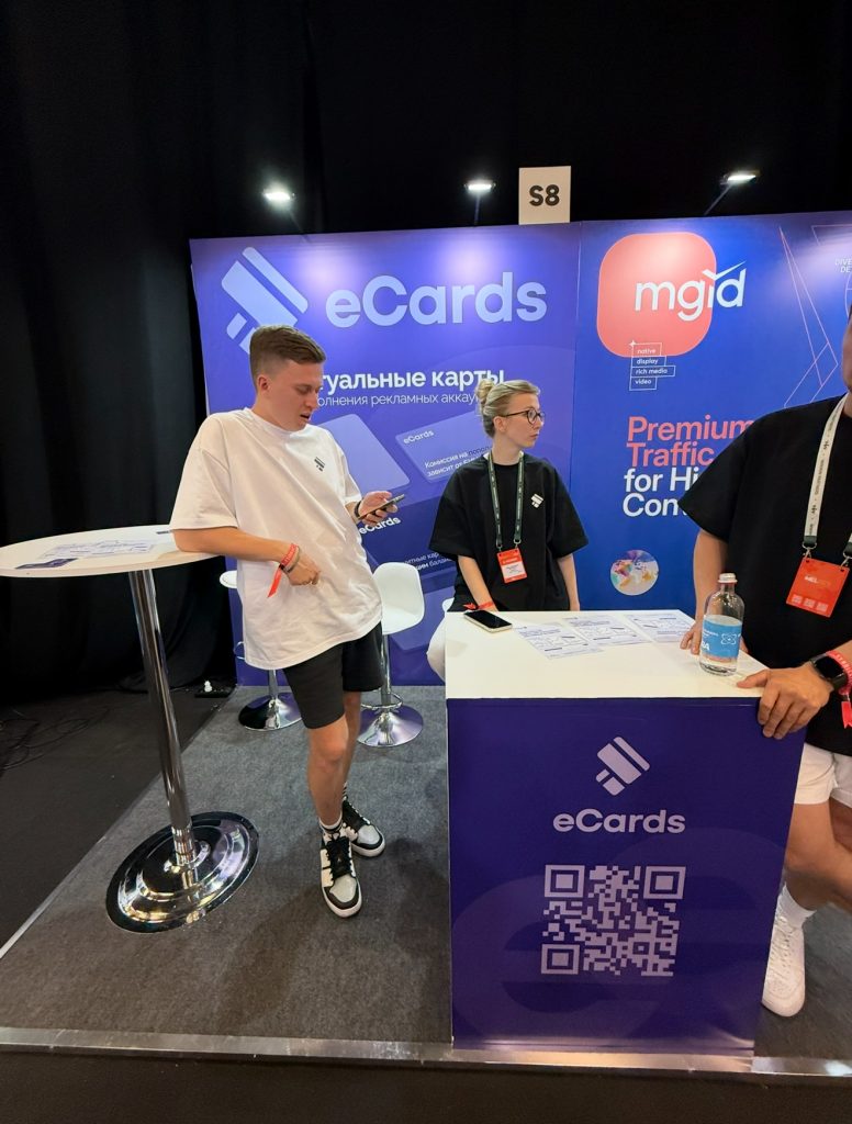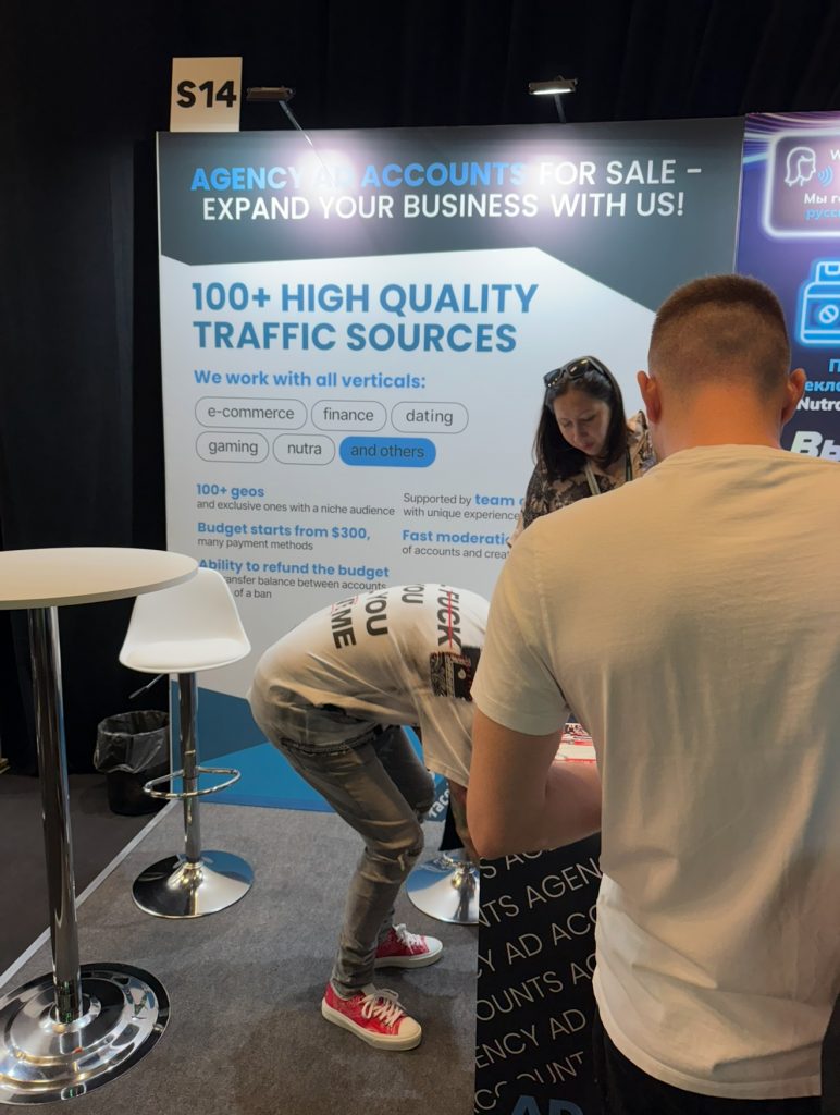 Тем временем, мы с вами перемещаемся в другой угол конференции. Здесь нас встретят с распростертыми объятиями: eCards (виртуальные карты для рекламы), MGID (платформа нативно рекламы), MetaCPA (международная нутра партнерская сеть), GAMBLE GROW (команда специалистов по партнерскому маркетингу), Ronin Skins (скины), OctoCPA (мульти-вертикальная CPA-сеть), Proxyseller (прокси), SafeCheck (чекер), ScroogeFrog (агентские аккаунты), Click Hub (нутра партнерская сеть).
