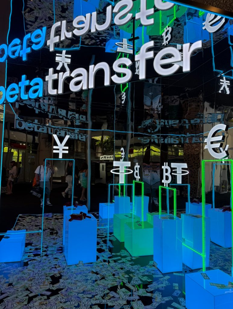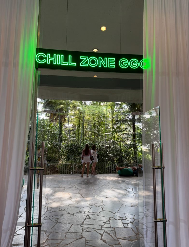 Если свернуть направо сразу за баром от MELBET, то мы попадаем с вами в CHILL ZONE от G GATE. Это большой зимний сад под куполом павильона, где царит абсолютная тишина, которую изредка прерывает тихая трель певчих птиц. Здесь можно было посидеть на пуфах и пообщаться с партнерами без лишних глаз и ушей, а заодно отдохнуть от бесконечной пестрой рекламы, поделать фоток и задуматься о своем будущем.