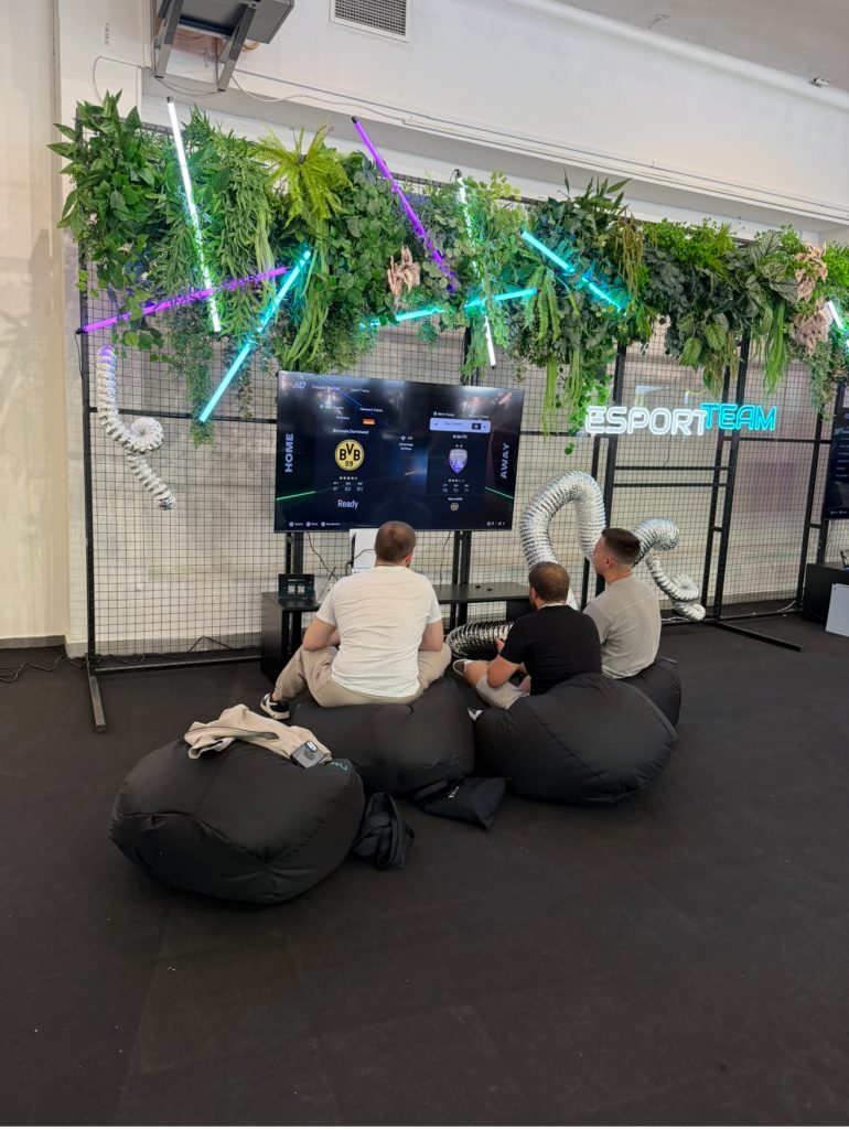 Проходим дальше вглубь павильона. Сначала нас встречает рабочая зона от PocketPartners (партнерская программа по бинарным опционам). Здесь можно было присесть на до боли привычное офисное кресло, зарядить телефон, перебрать сумки с мерчом и поработать с ноутбуком. Далее за ней, в самом центре второго павильона – зона залива нутры от ADCOMBO. 16 столов в конфигурации 4×4, на каждом столе были ноутбуки для залива. В течение двух дней финалисты курса залива нутры от Adcombо. К любому участнику можно было подойти и задать интересующий вопрос по тому, как он льет нутру. Вообще любой и каждому проходящему! Честно скажу, что побоялся воспользоваться данной опцией – на кону у 16 команд стоял призовой фонд в $80 000 и я бы никогда не простил себе, если бы отвлек кого-то из участников своими глупостями и отдалил их победу. Необычная активность, однако. Следом за зоной залива стояла спонтанная зона от ESPORTTEAM (киберспорт). В этой зоне можно было поиграть в приставку, пинг-понг, попробовать свои силы в виртуальной реальности на специальном аппарате.