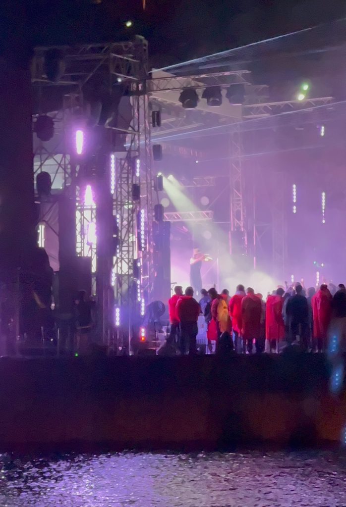Перед самым стартом мероприятия погода резко ухудшилась – метеостанции вещали о надвигающемся ливне. Всем разослали предупреждение о том, что стоит выбрать теплую одежду – около воды обычно значительно прохладнее. По приезде всем гостям дополнительно выдавали дождевики, на случай, если дождь решит разыграться прямо во время концертной программы. Собственно, так и произошло, но никак не испортило лично мои впечатления. Стихия, наоборот, добавила красок и без того яркому событию.