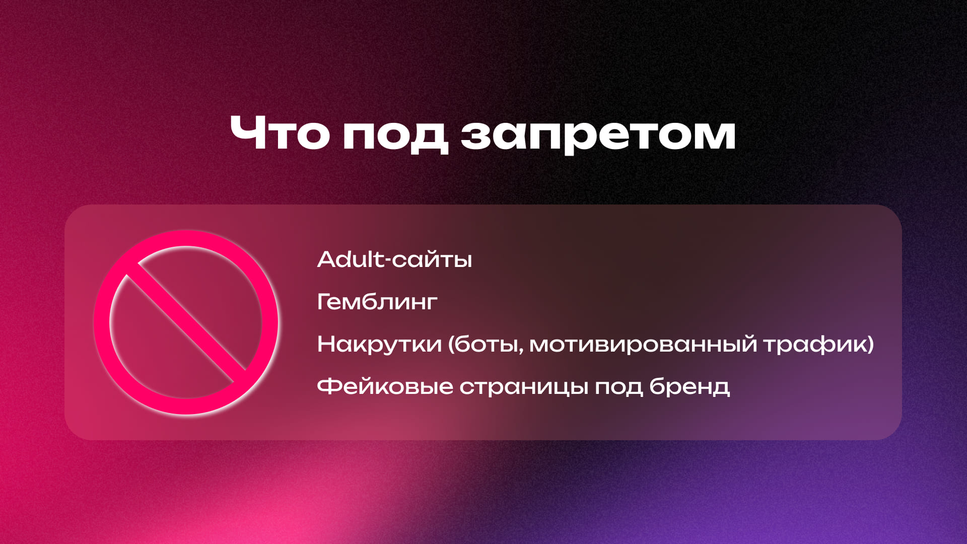 Adult, гемблинг, стимулированный трафик (клики за деньги), тизеры с шокирующим контентом, который дискредитирует бренд. Авито дорожит репутацией, поэтому за такой трафик могут заблокировать навсегда.