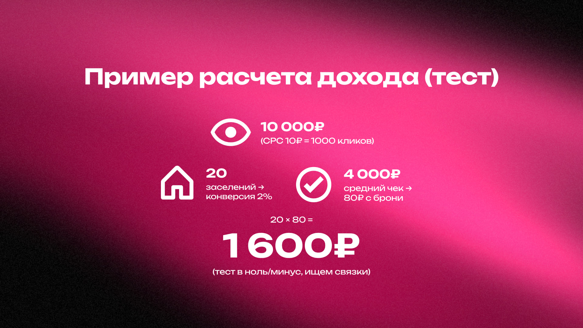 Вы покупаете трафик по 10 рублей за клик (CPC). Получаете 1000 кликов. При конверсии 2% — это 20 заселений.