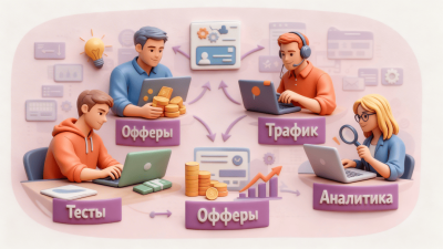 Командный формат предполагает распределение задач между несколькими участниками. Один отвечает за трафик, другой за креативы, третий за аналитику и контроль показателей, четвёртый — за техническую часть и аккаунты. При этом команда — это не обязательно агентство. Часто речь идёт о небольшой связке из 2–4 человек.