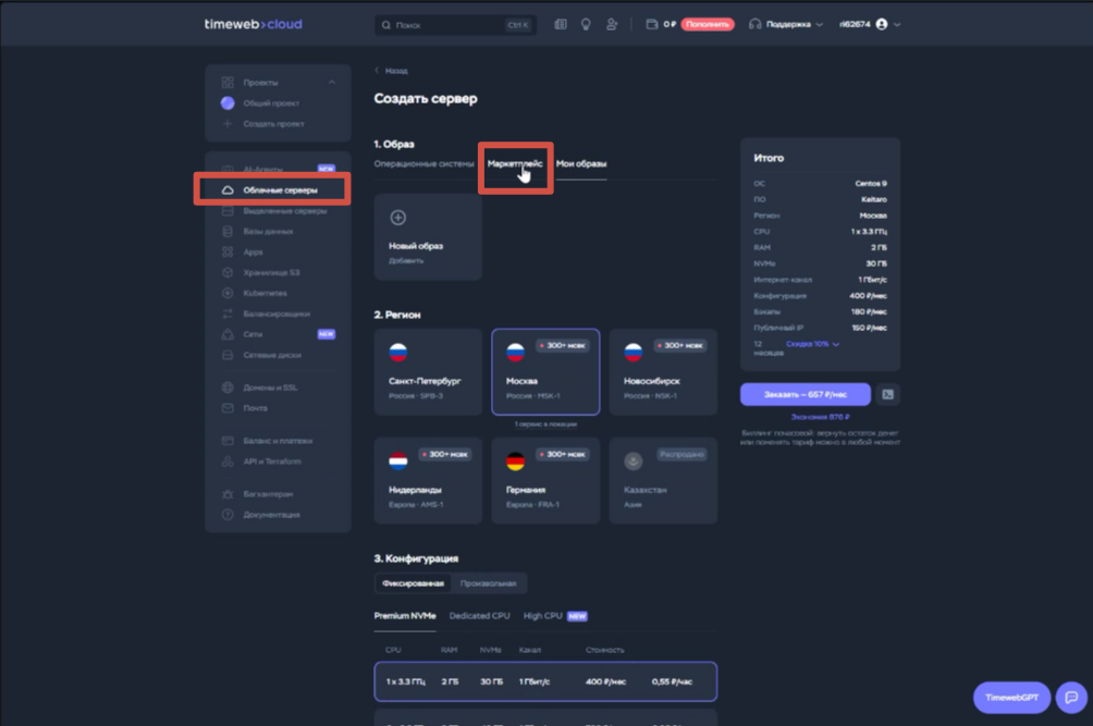 Открываем панель Timeweb Cloud. В разделе «Облачные серверы» выбираем вкладку «Маркетплейс».