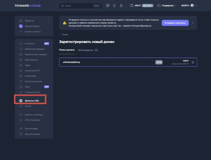 Во вкладке «Домены и SSL» заказываем домен. После оплаты он автоматически привяжется к вашему серверу.
