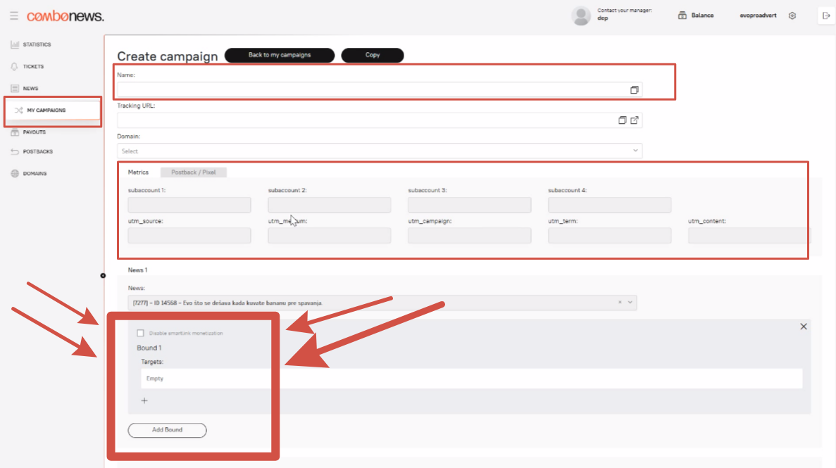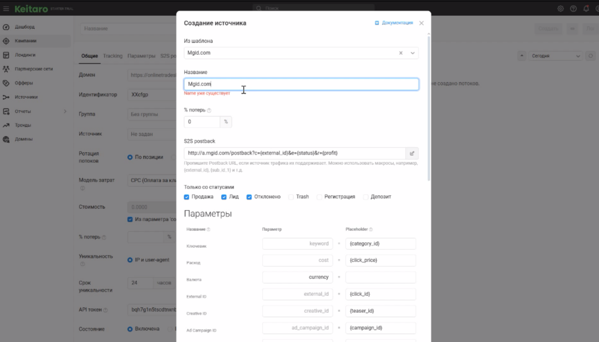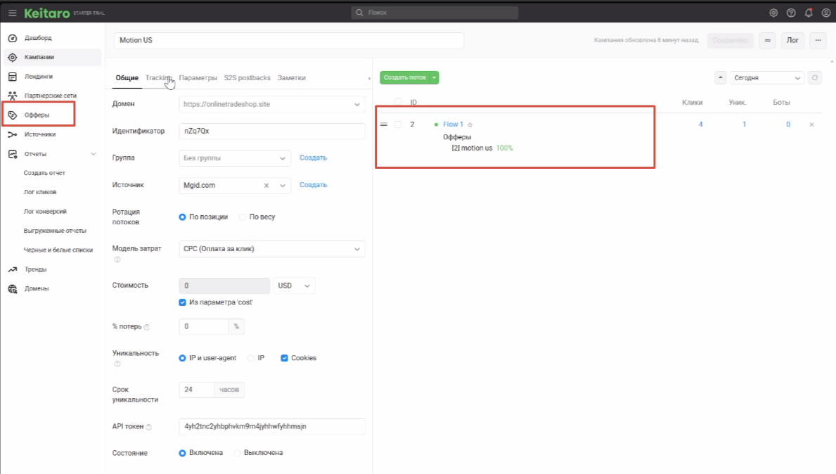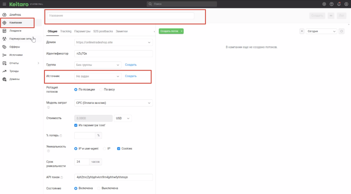 Теперь нужно указать макросы из Keitaro. Для этого возвращаемся в трекер и создаем готовую тестовую кампанию.
