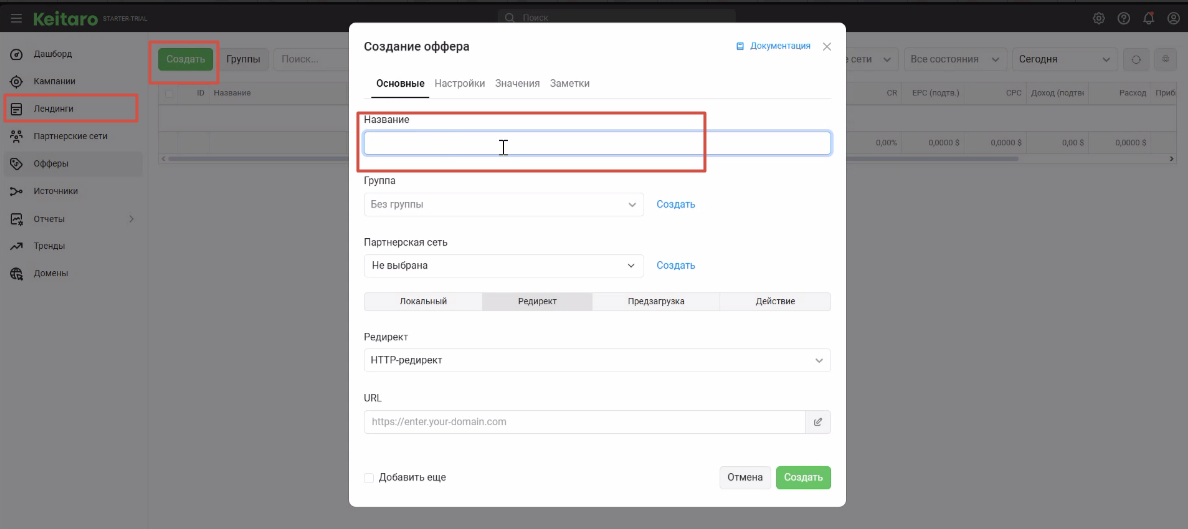 В трекере переходим во вкладку «Офферы» и нажимаем «Создать».