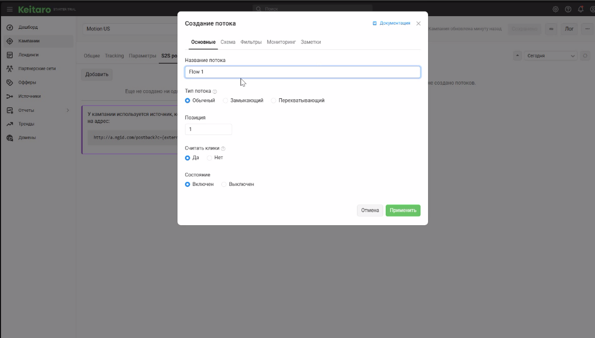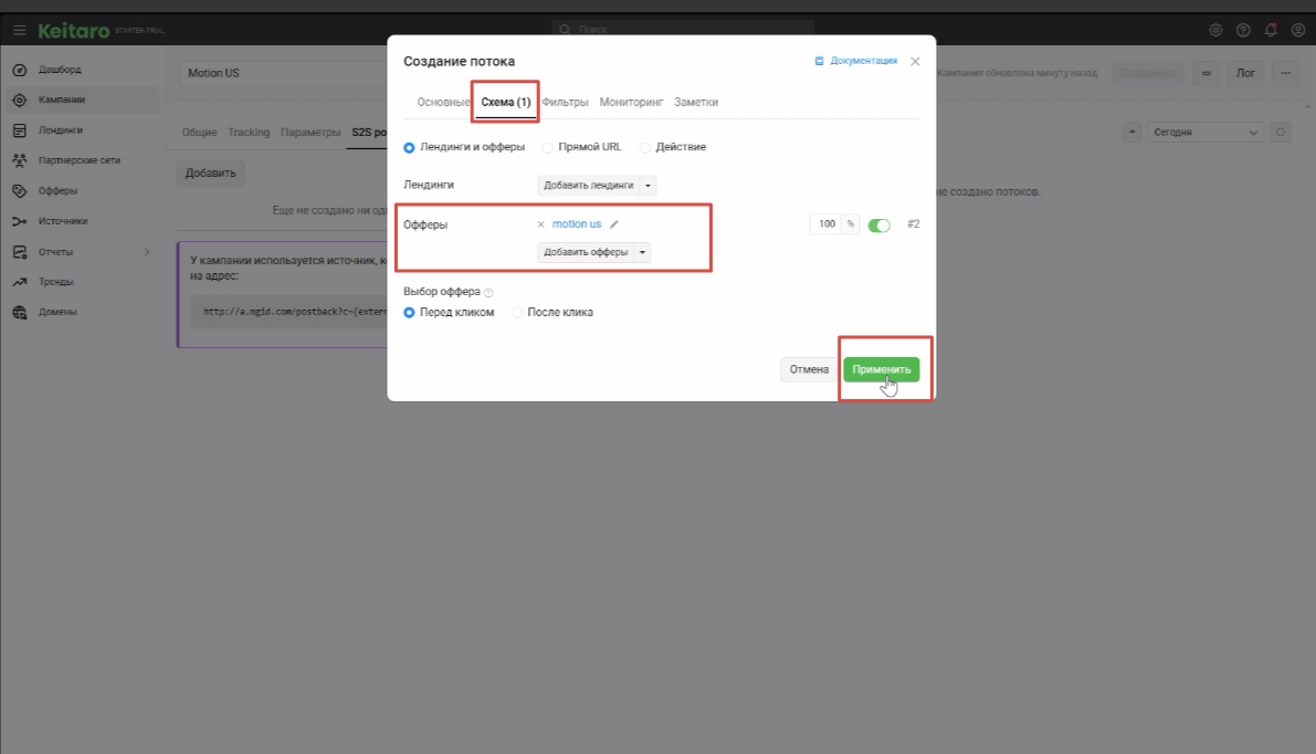 Указываем название потока, переходим во вкладку «Схемы» и выбираем наш оффер.