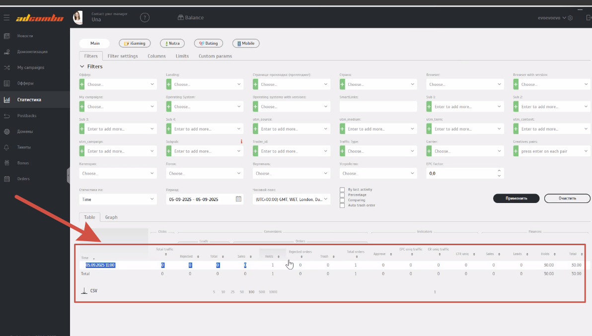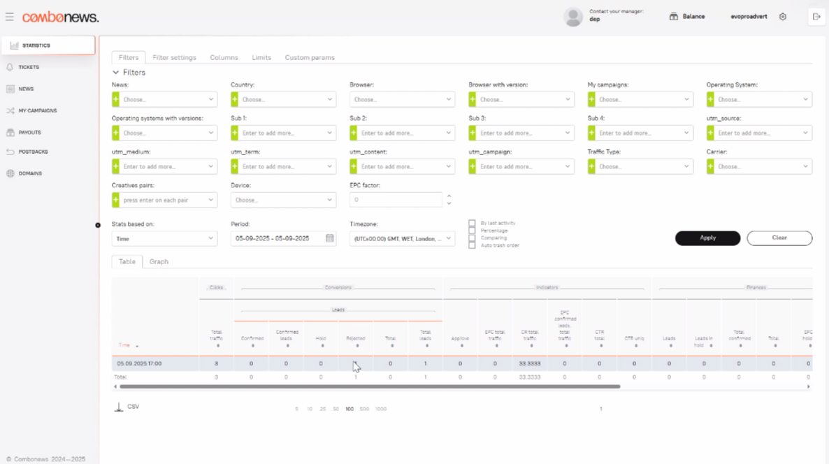 В разделе «Statistics» можно просмотреть количество переходов и тестовый лид. Ориентироваться стоит на количество кликов и CTR по вашему трафику. Чем он выше, тем больше посетители читали новостей, и тем больше у витрины пробив.