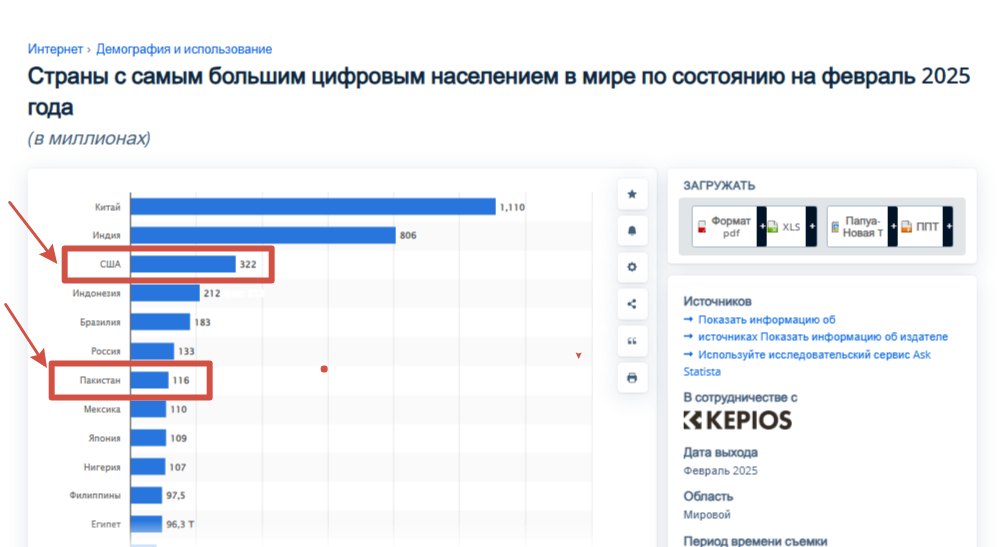 Но за счет разных уровней экономики и инфраструктуры в США около 322 млн интернет-пользователей, а в Пакистане — всего 116 млн пользователей.