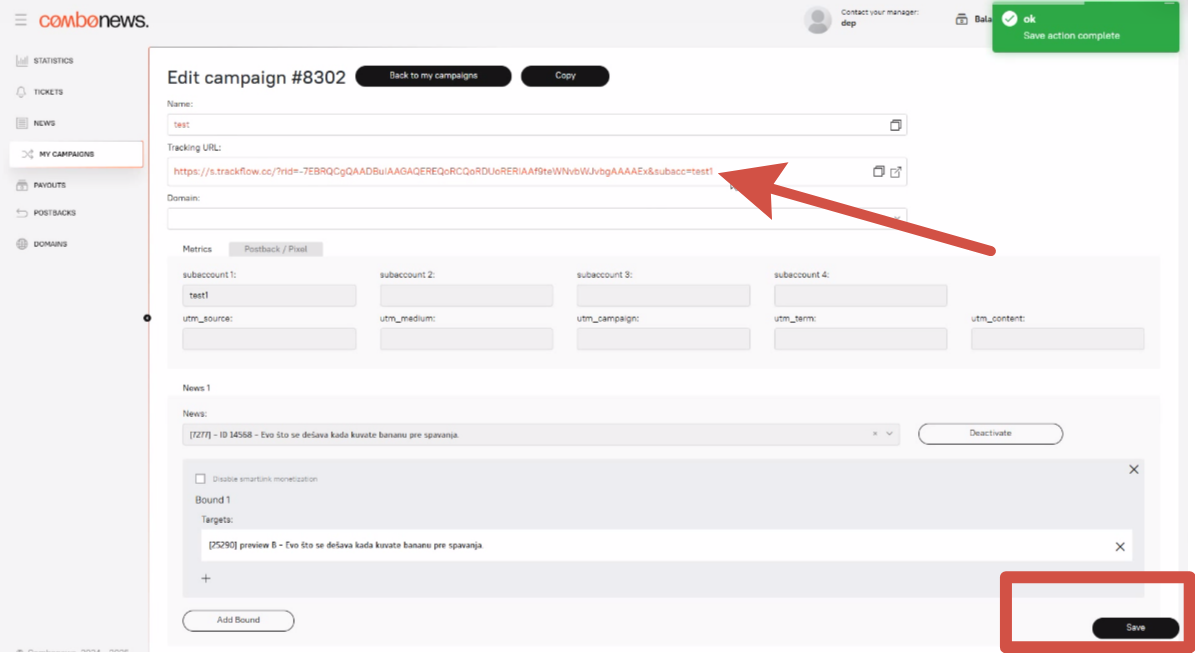Для запуска кампании нажимаем «Save». Появится ссылка для залива.