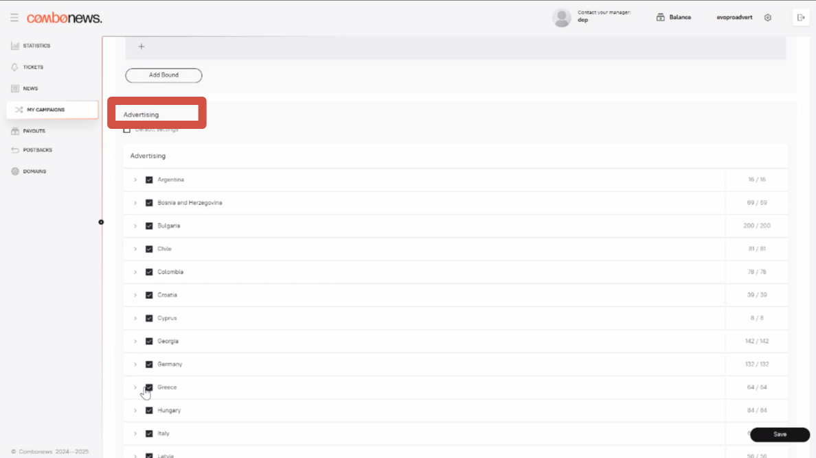 При создании кампании проскрольте страницу вниз до раздела «Adversting». Снимите галочки с определенных стран, так вы отключите их от показа.