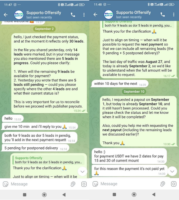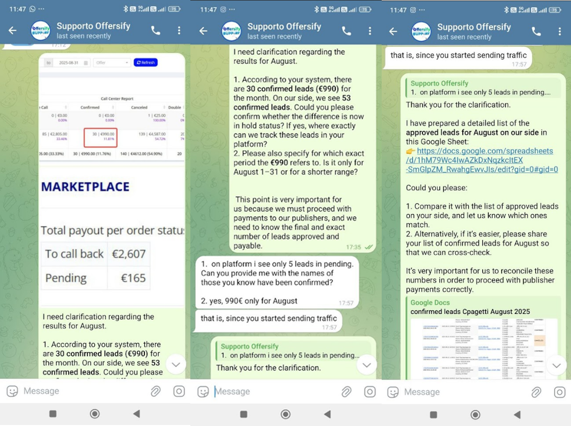 Формального договора или Insertion Order не было. Договоренности закреплялись через переписку с менеджером и общие чаты с Offersify. Также не было заранее оговорено, что именно считается качественным лидом и фродом.