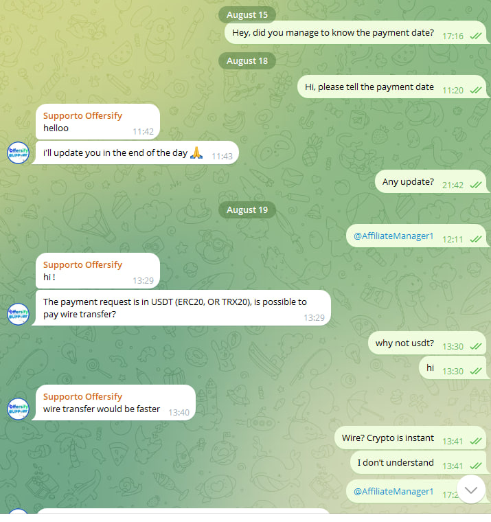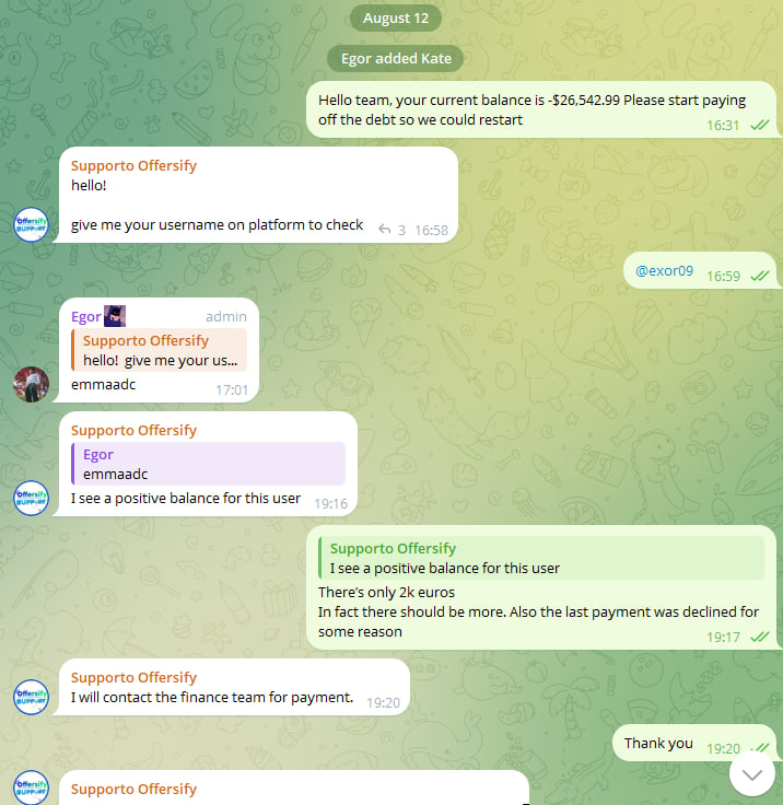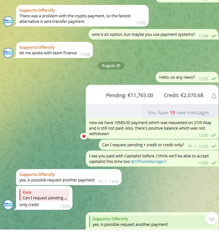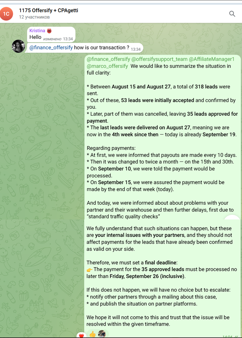 С похожей ситуацией столкнулись и представители другой партнерки, сотрудничавшей с Offersify — CPAgetti. Их партнерство началось осенью 2023 года, но активно работать начали только в августе этого года. Именно тогда пошли лиды, и возникла проблема с выплатами.