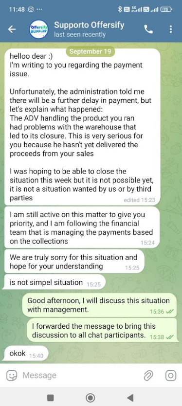 После того как я начала настойчиво спрашивать про выплаты, Offersify перестали отвечать. В общем чате и в личных сообщениях они не реагируют. Просто молчание и никаких шагов с их стороны