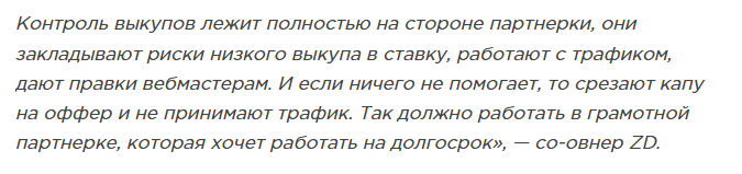 А вот контроль за выкупом, по мнению команды ZD, лежит на рекламодателе. При этом в их договоренностях не было привязки к выкупу — команда лила трафик по CPA с оплатой за апрувнутый лид.