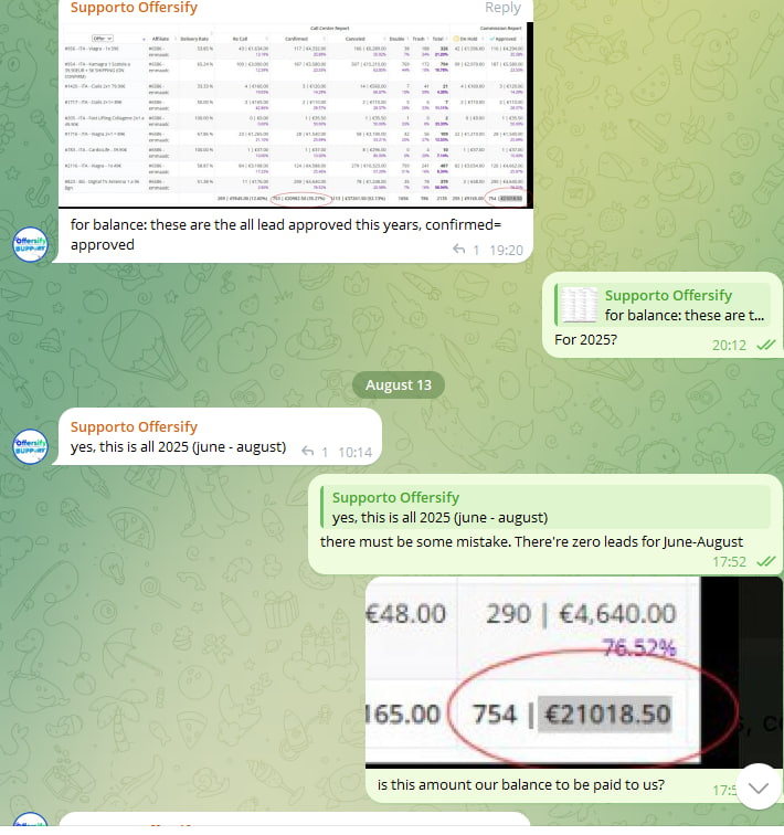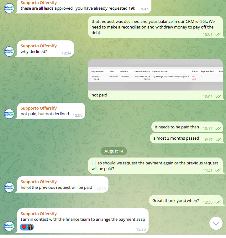 AdCombo не запрашивали вывод средств, а рекл напоминал об оплатах. К маю 2025 года на счету AdCombo скопилась солидная сумма. 21 мая они выставили счет на оплату $19 500 за предыдущие месяцы. И началась история мошенничества all’italiana. К 12 августа выплата все еще не поступила, а долг Offersify увеличился до ~ $26 500 за счет положительного баланса.