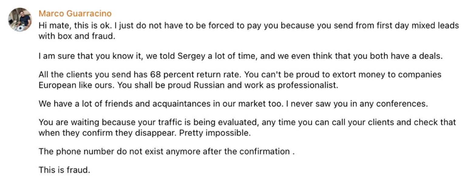 Попытки решить ситуацию через менеджера не увенчались успехом. Поэтому команда напрямую обратилась к CEO Offersify Marco Guarracino. Его ответ был жестким — весь трафик ZD он назвал фродом и отказался платить.